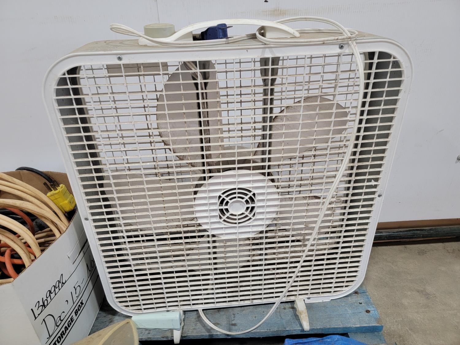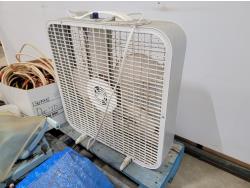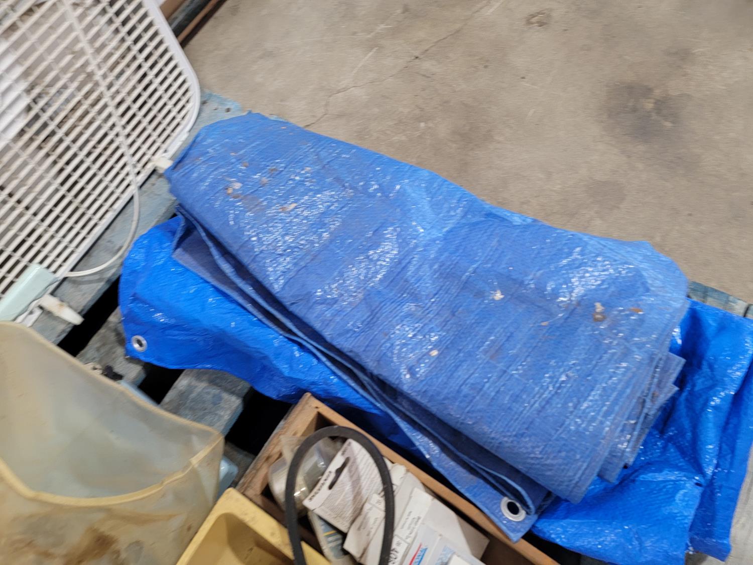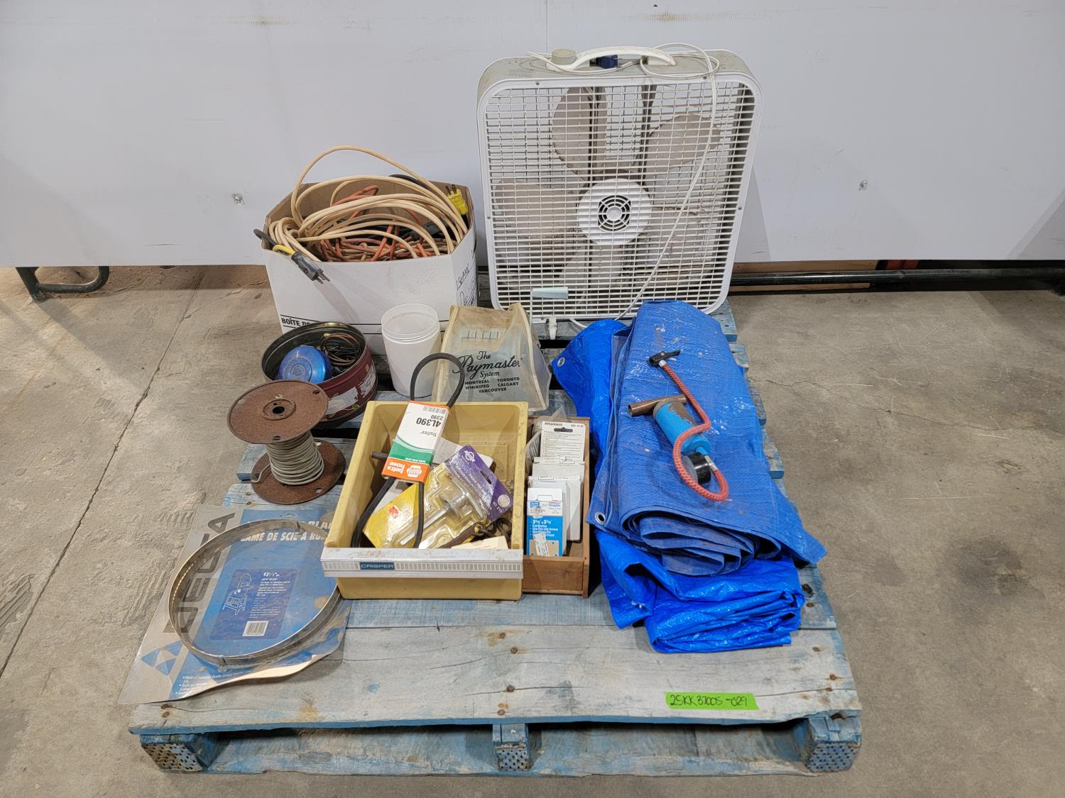box fan, electrical cords, tarps, partial roll of electrical wire, bandsaw blade