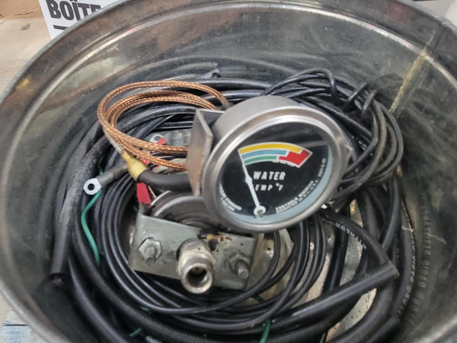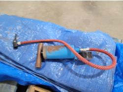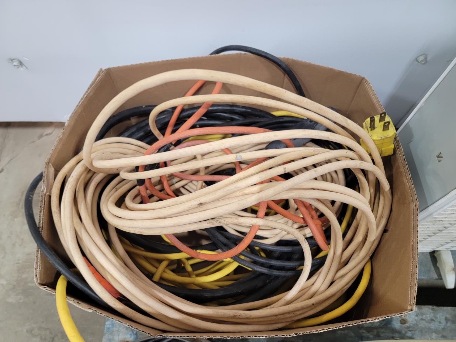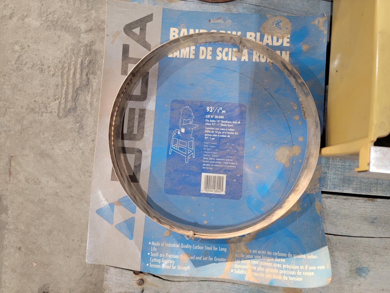 box fan, electrical cords, tarps, partial roll of electrical wire, bandsaw blade