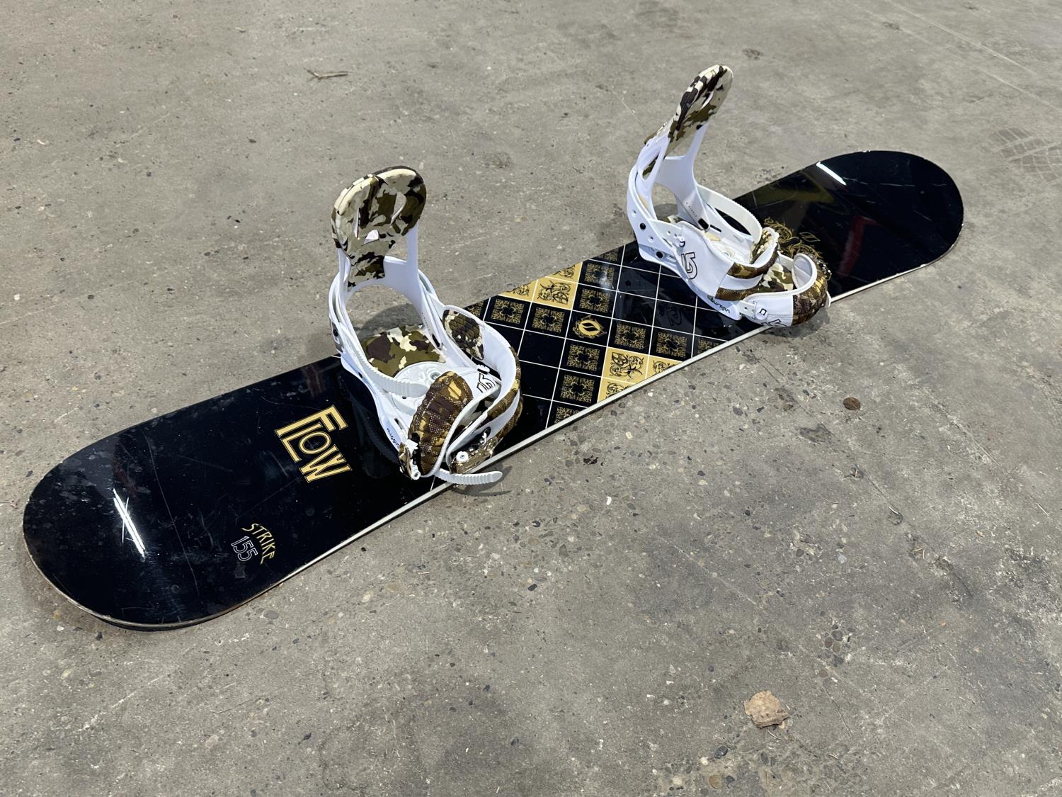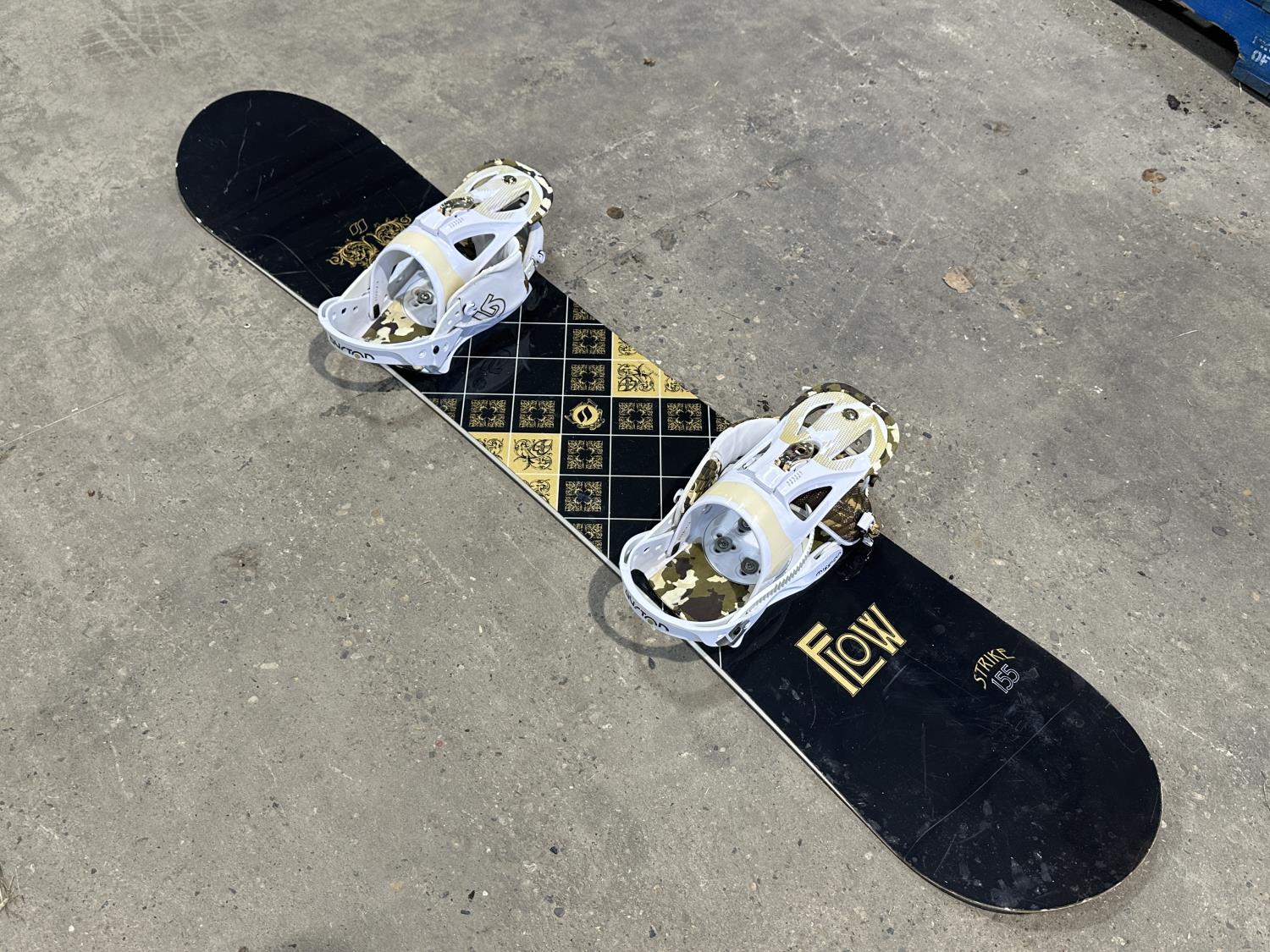 Flow Strike 155 snowboard, Rossignol size 10.5 snowboard boots, ski goggles, gloves, Firefly size XL ski pants, Mole snowboard bag