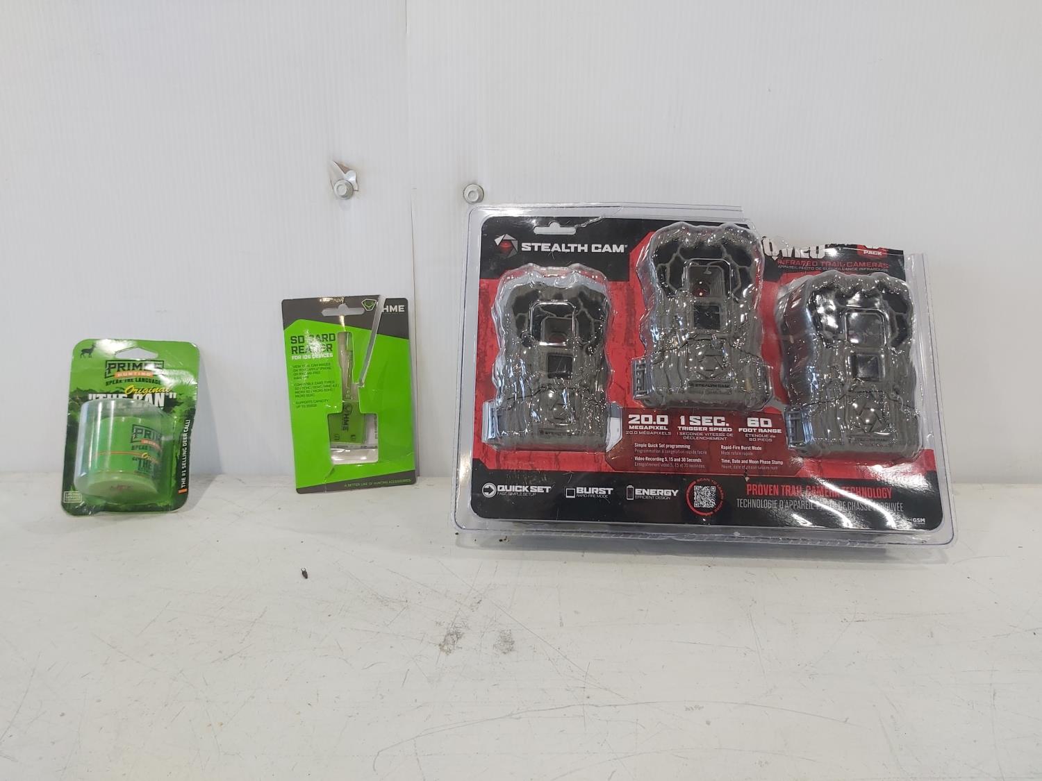 1604 Stealth Cam 3 Piece Trail Cameras, SD Card Reader and "The Can" Deer Call
