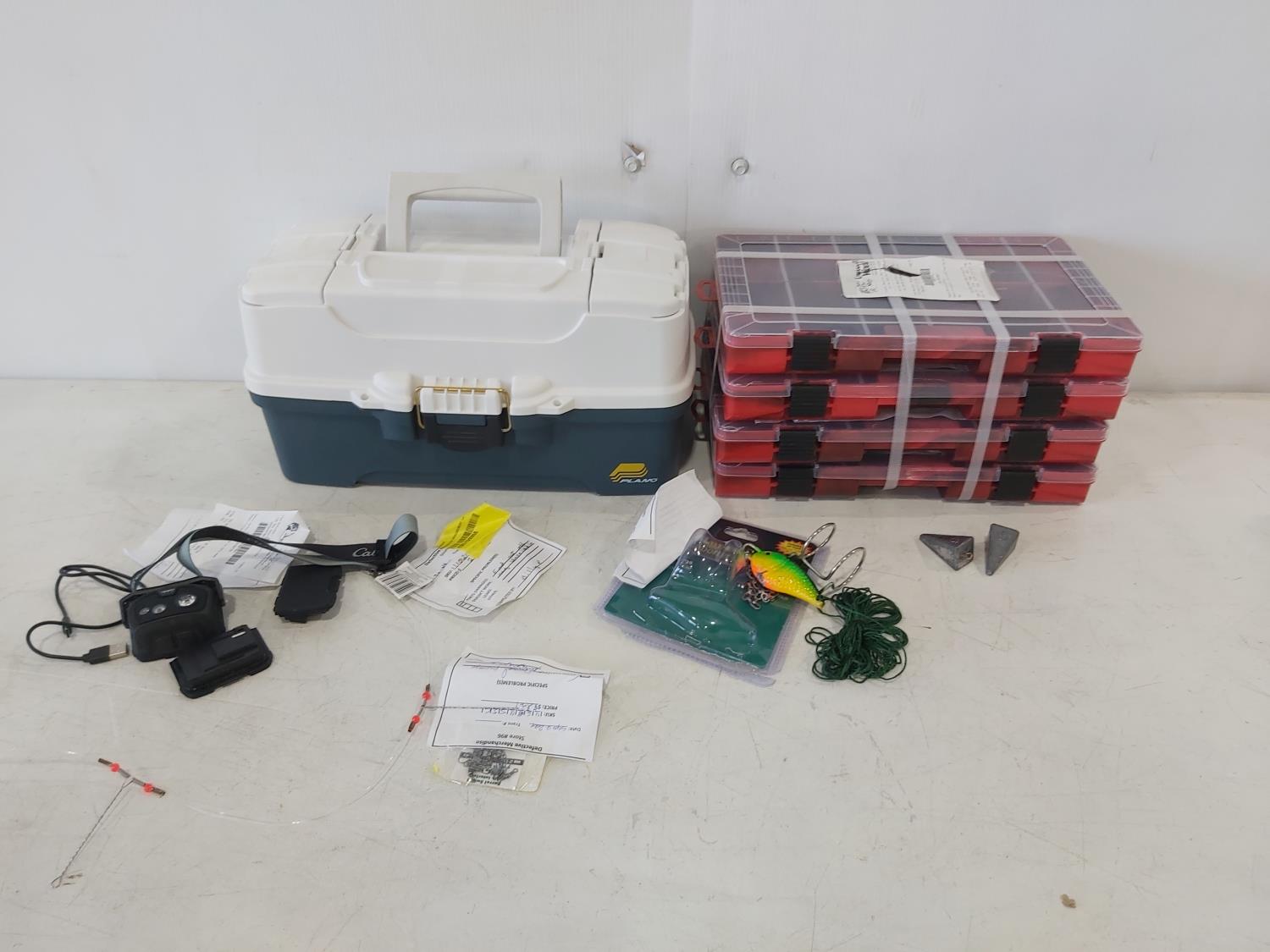 1183 Plano Tackle Box, (4) Plastic Organizer Trays, Fishing Accessories and Head Lamp