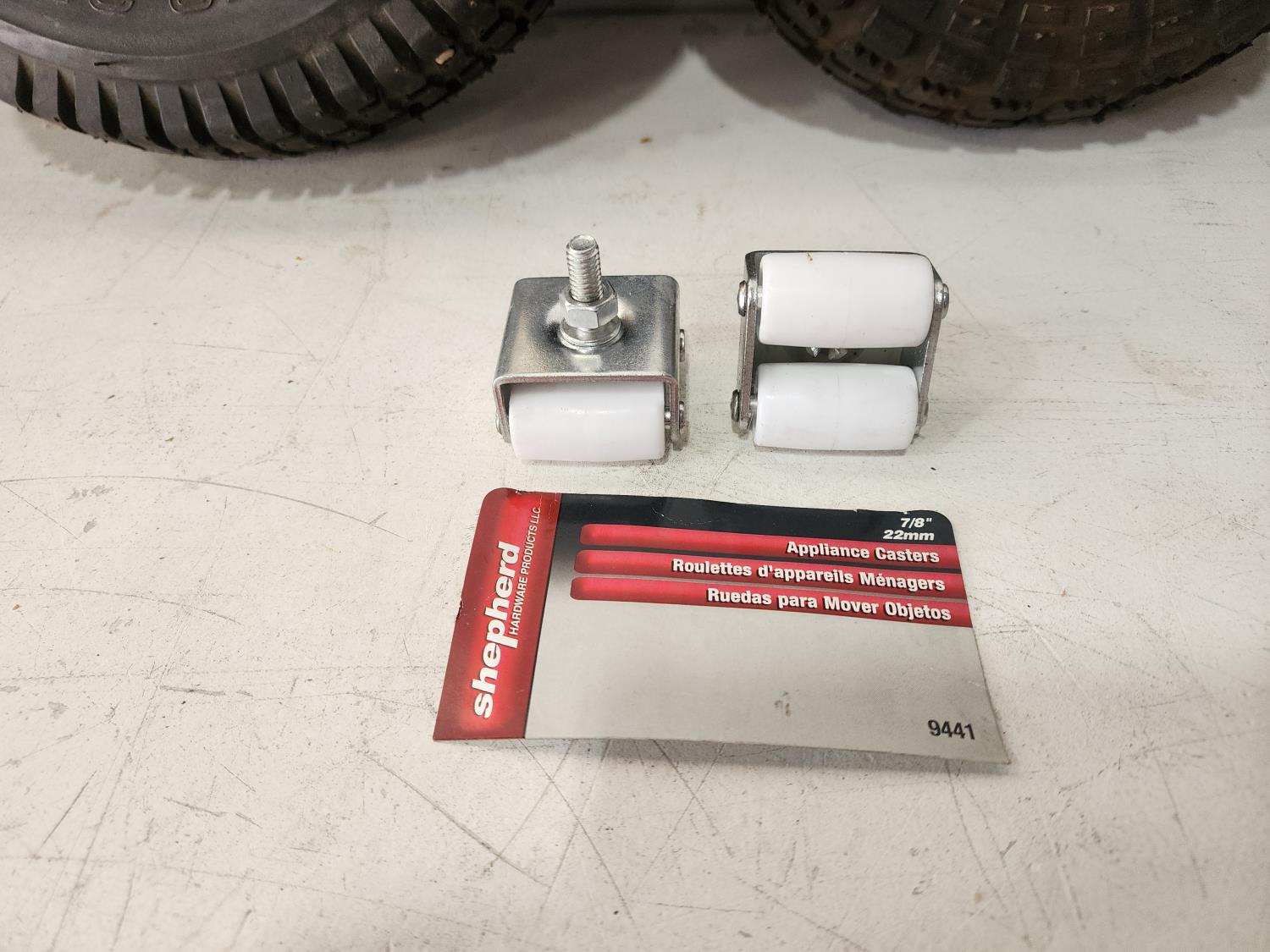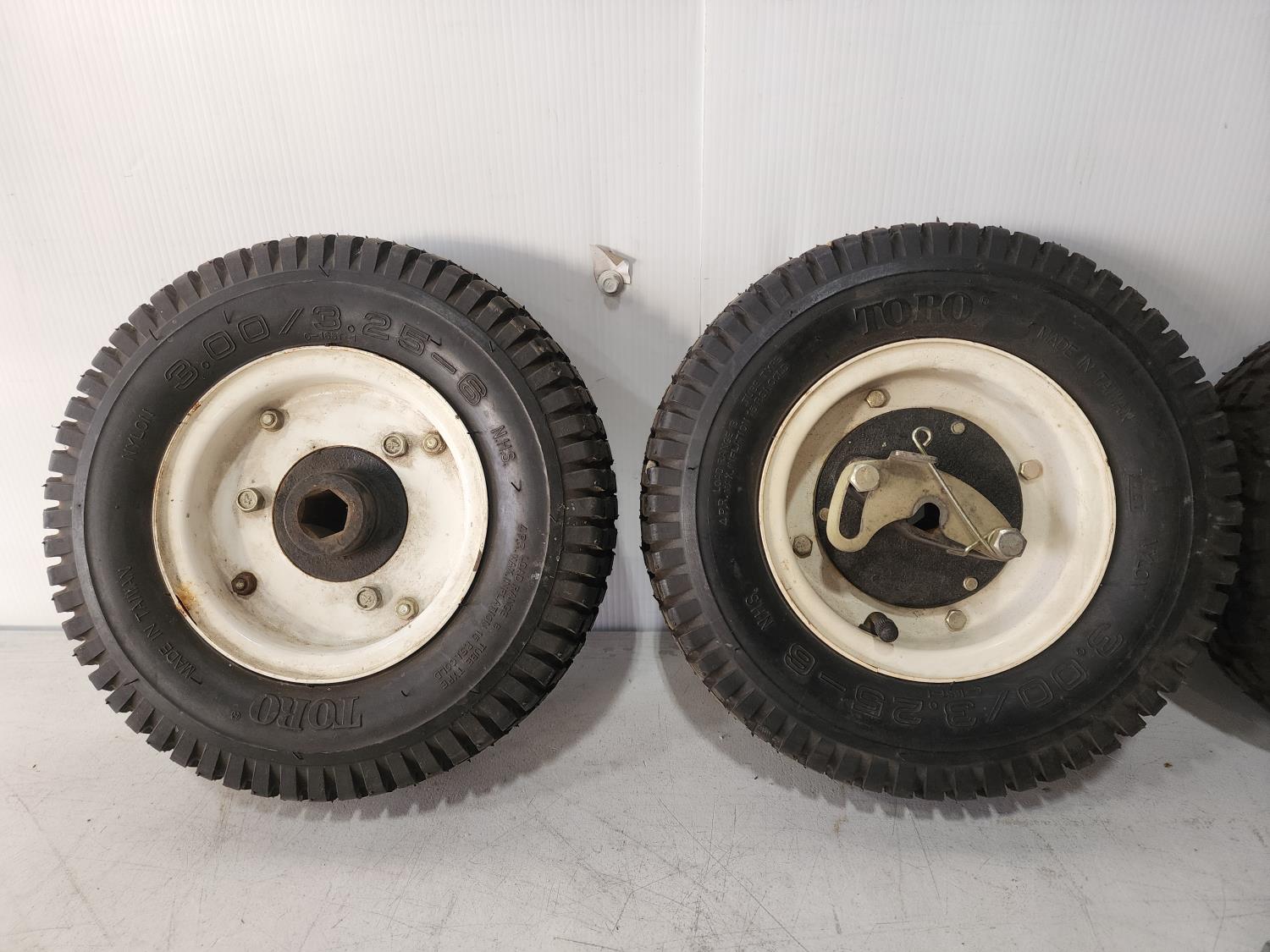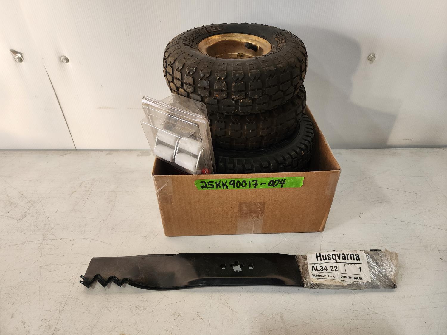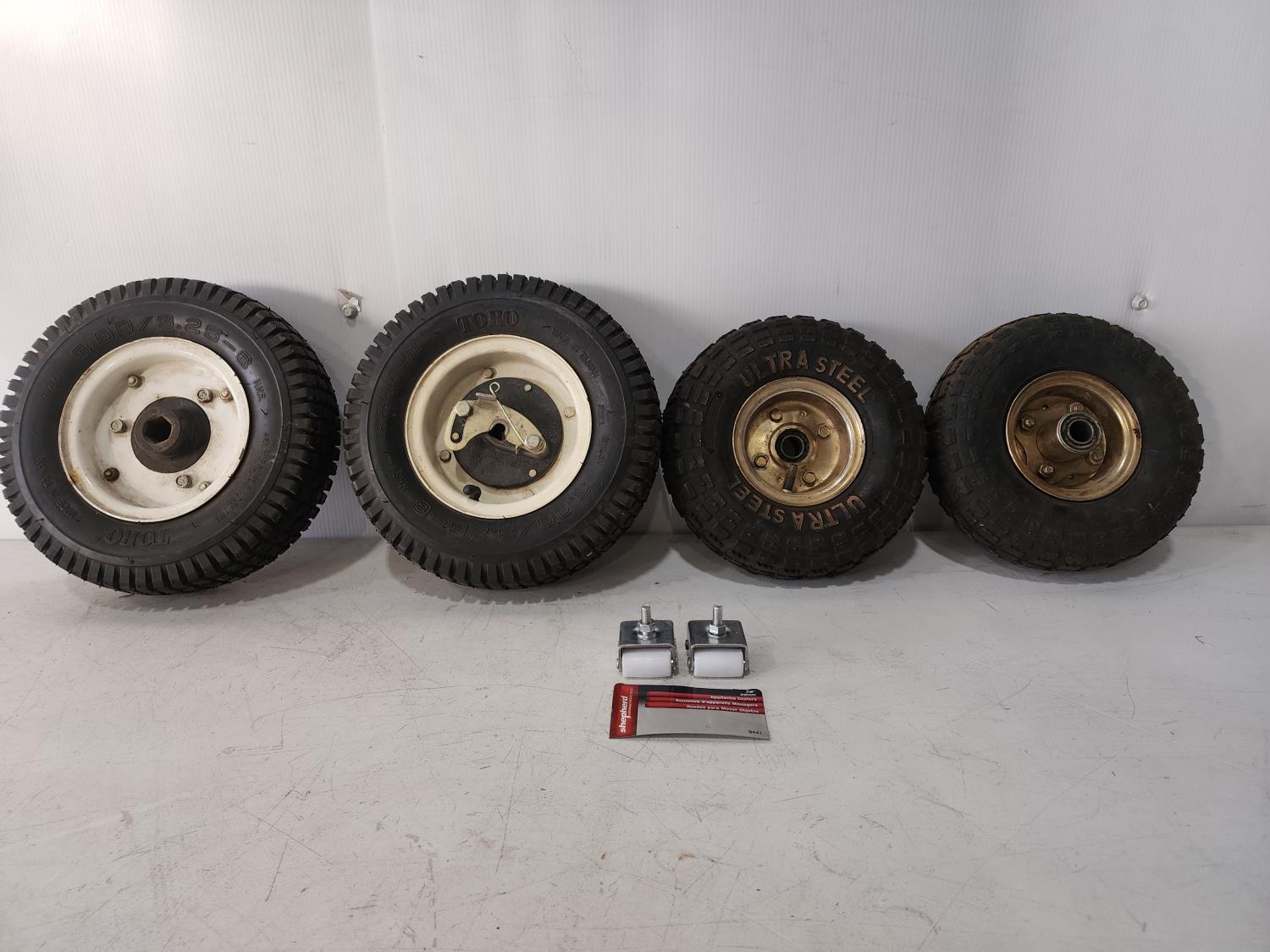 1203 (2) Toro 3.00/3.25-6 Tires with Rims, (2) Ultrasteel 4.10/3.50-4 Tires with Rims, (2) Appliance Casters and (2) Husqvarna 21.4 Inch Mulching Blades