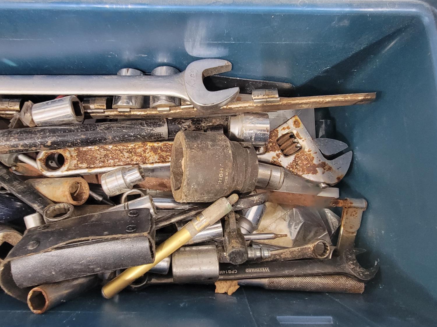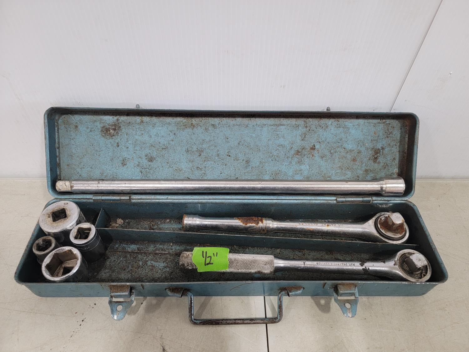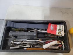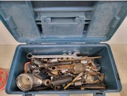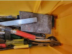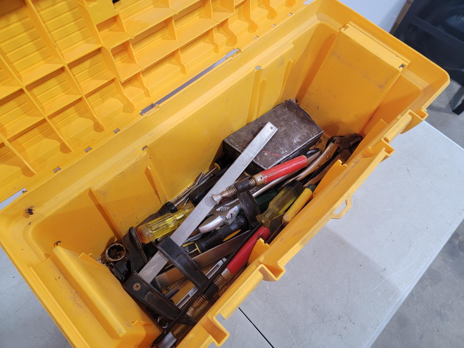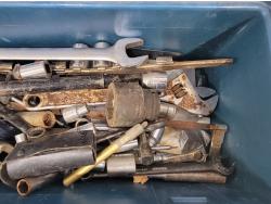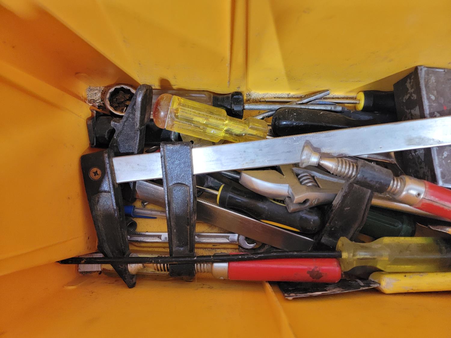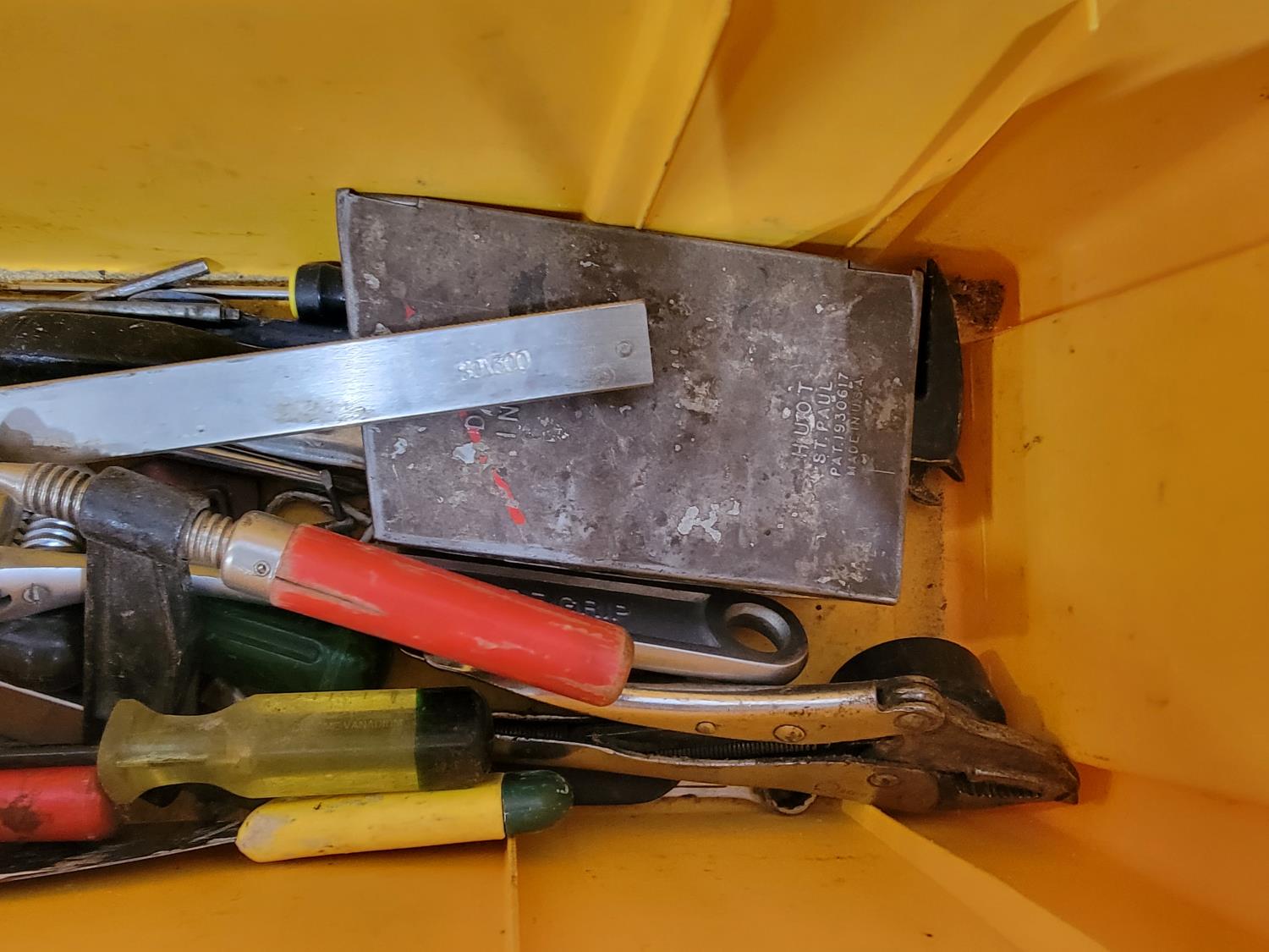 1/2 inch drive ratchet wrenches and sockets, clamps, screwdrivers, vise grips, combination wrenches, bits
