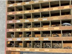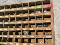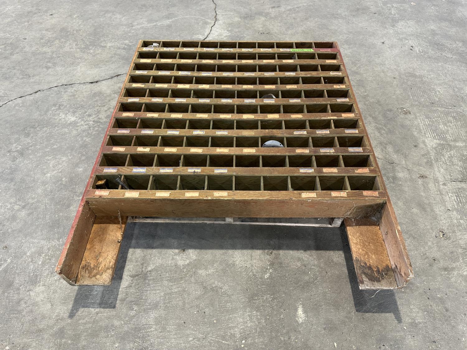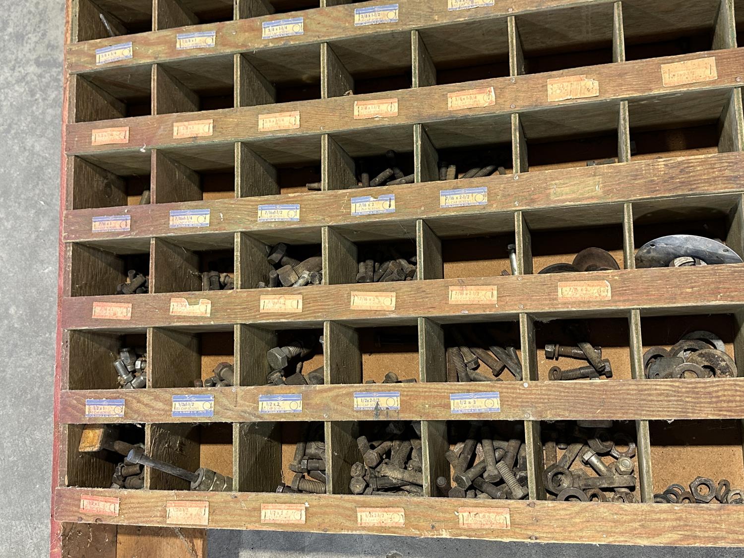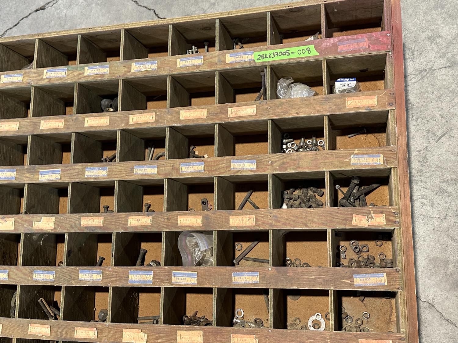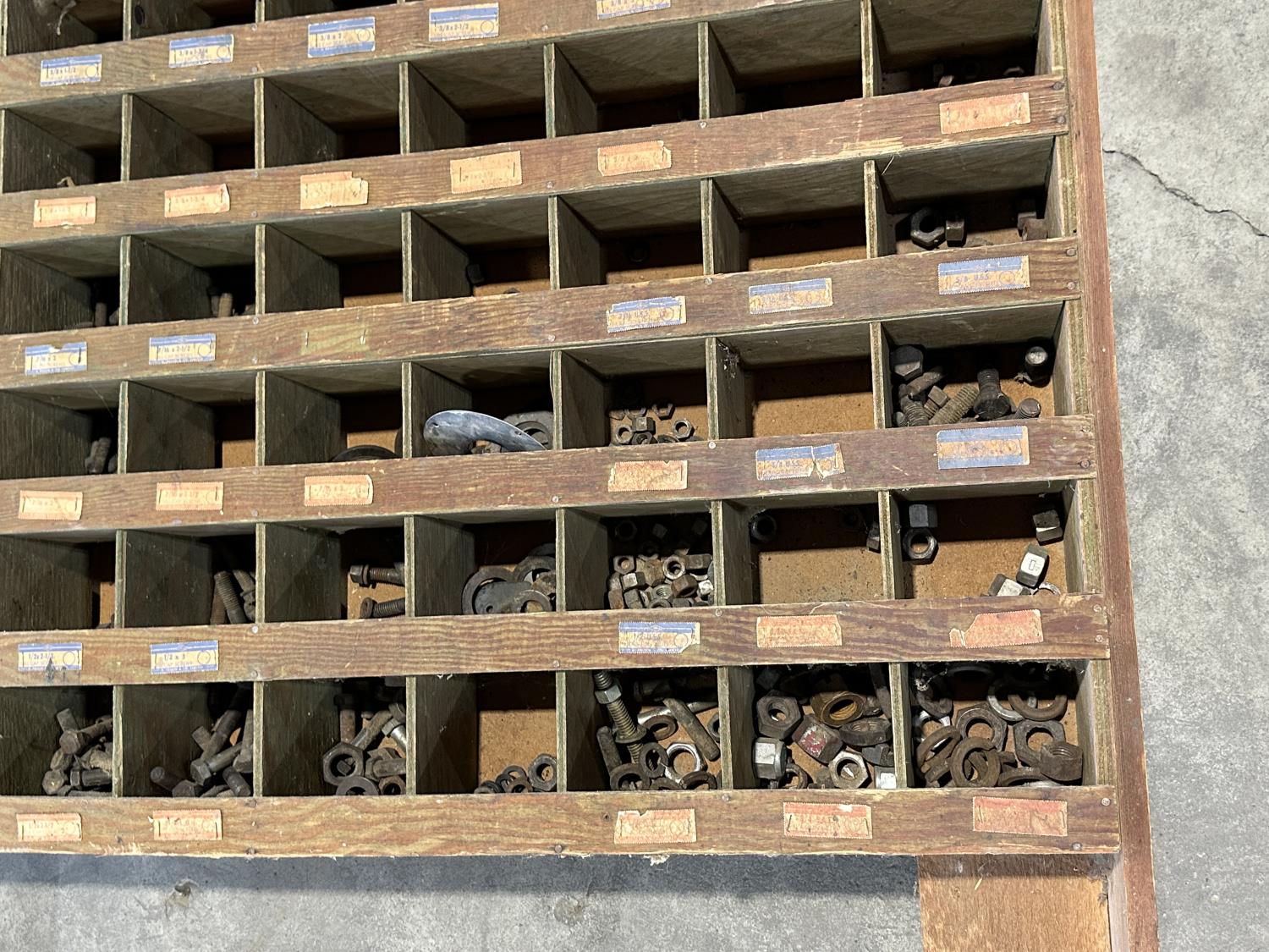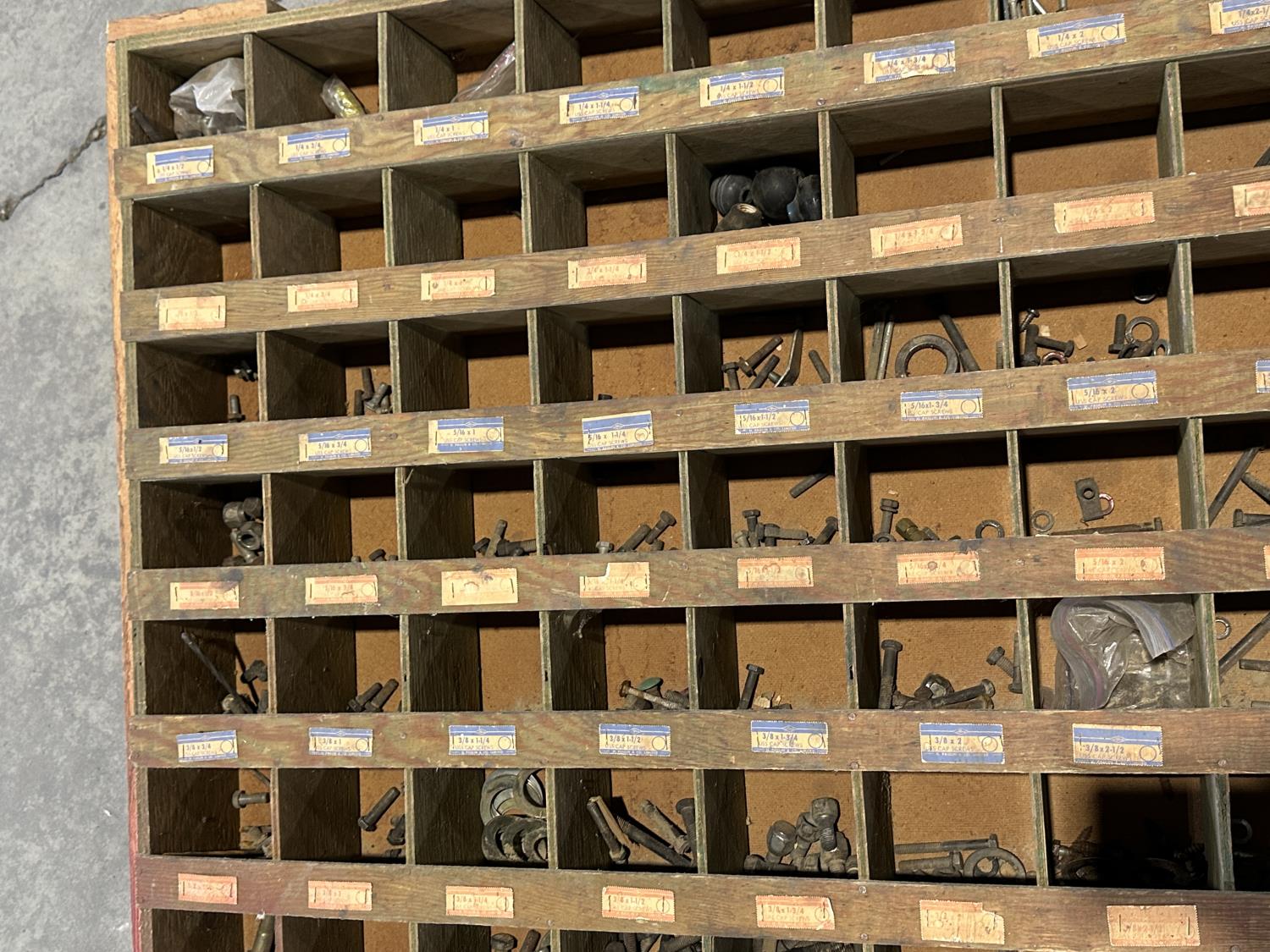 1297 Wooden 100 Compartment Bolt Bin with Contents