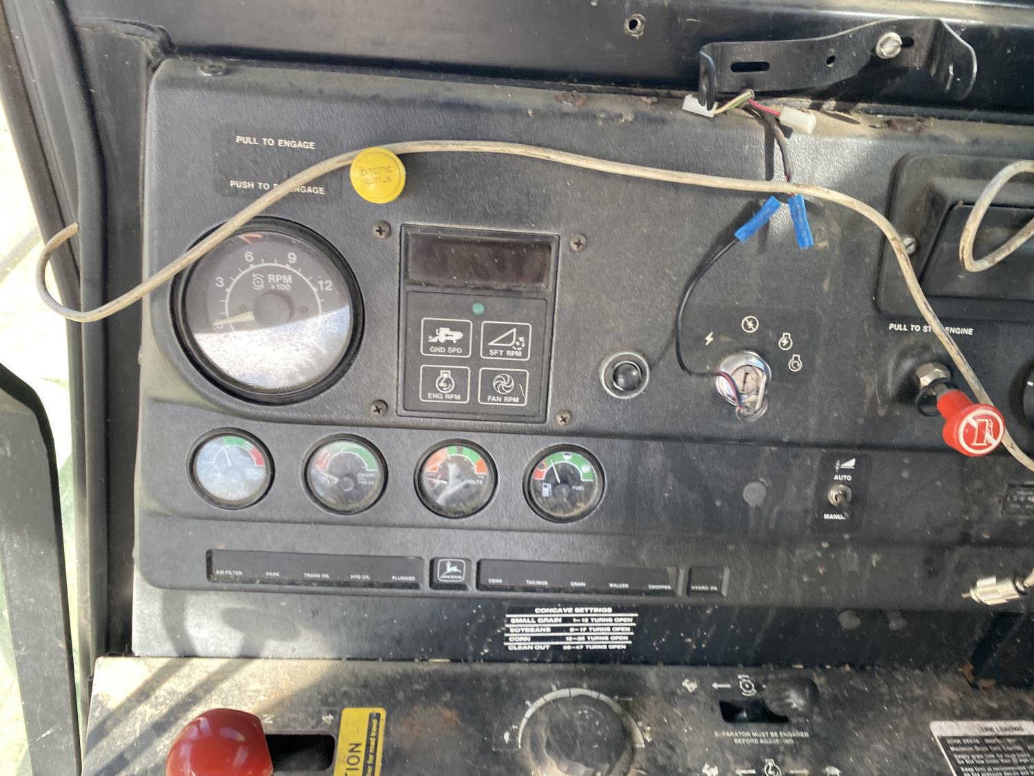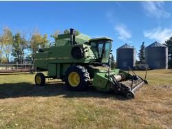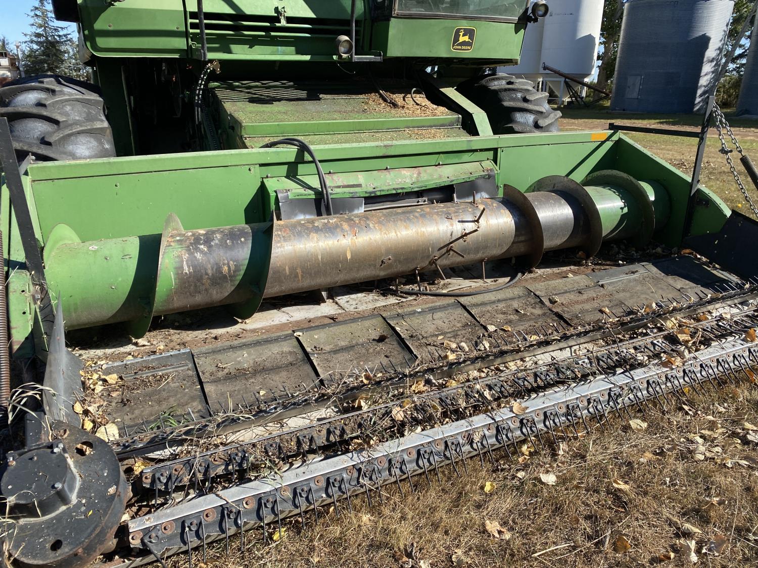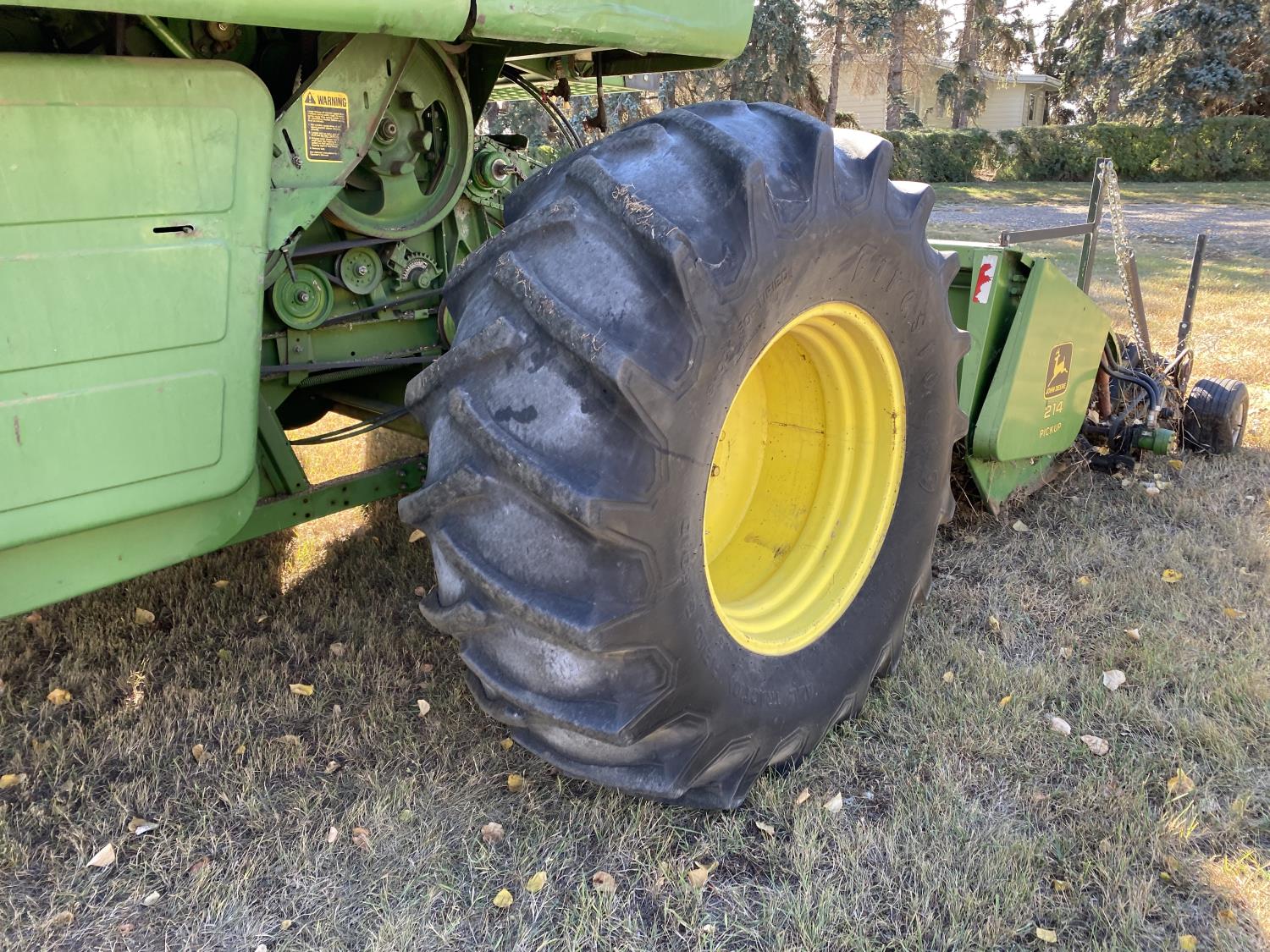 John Deere 214 14 ft pick-up header, variable speed reel, chopper/straw spreader, 16 ft auger, 24.5-32 front tires, 11.25-24 rear tires