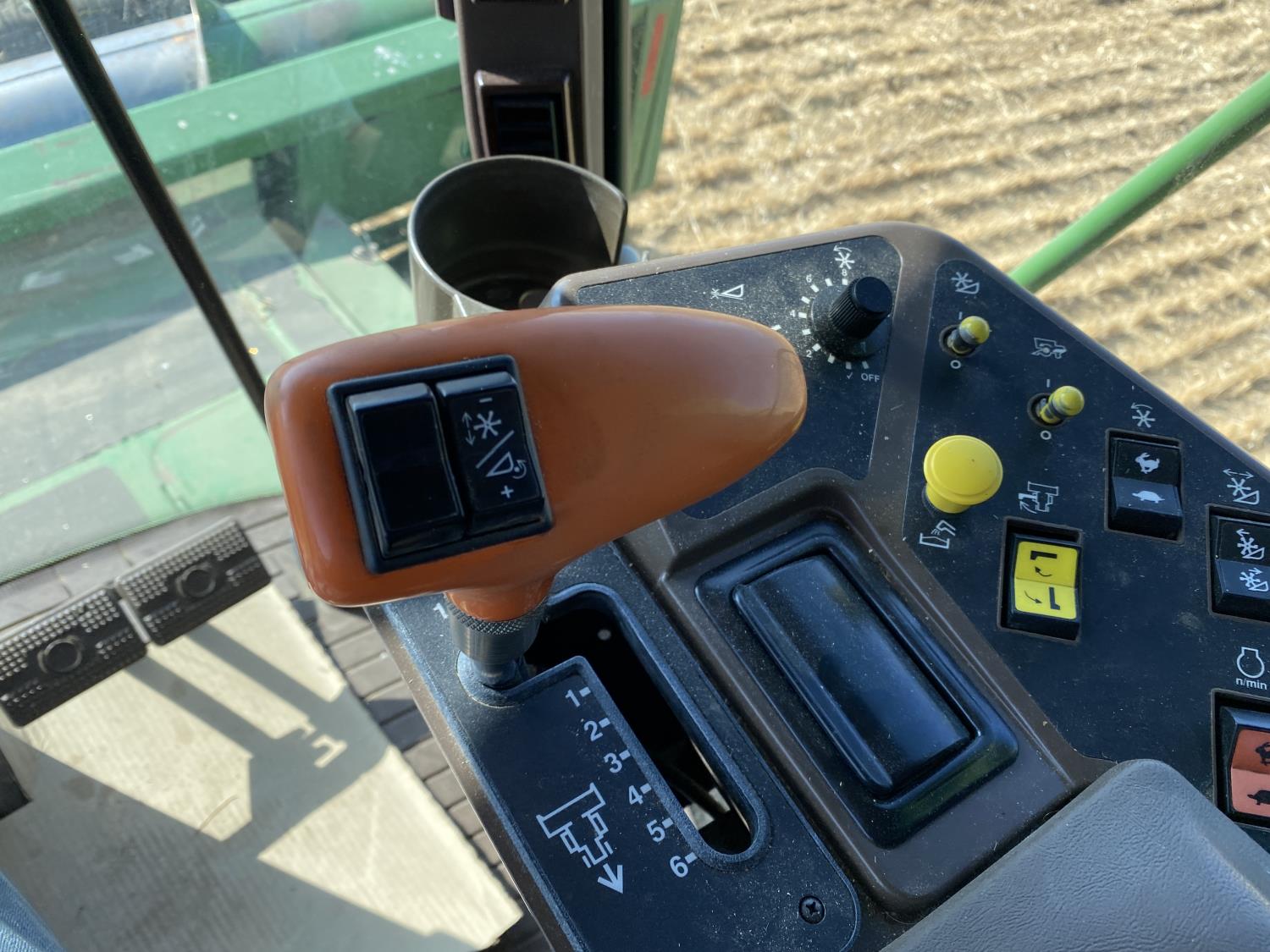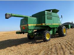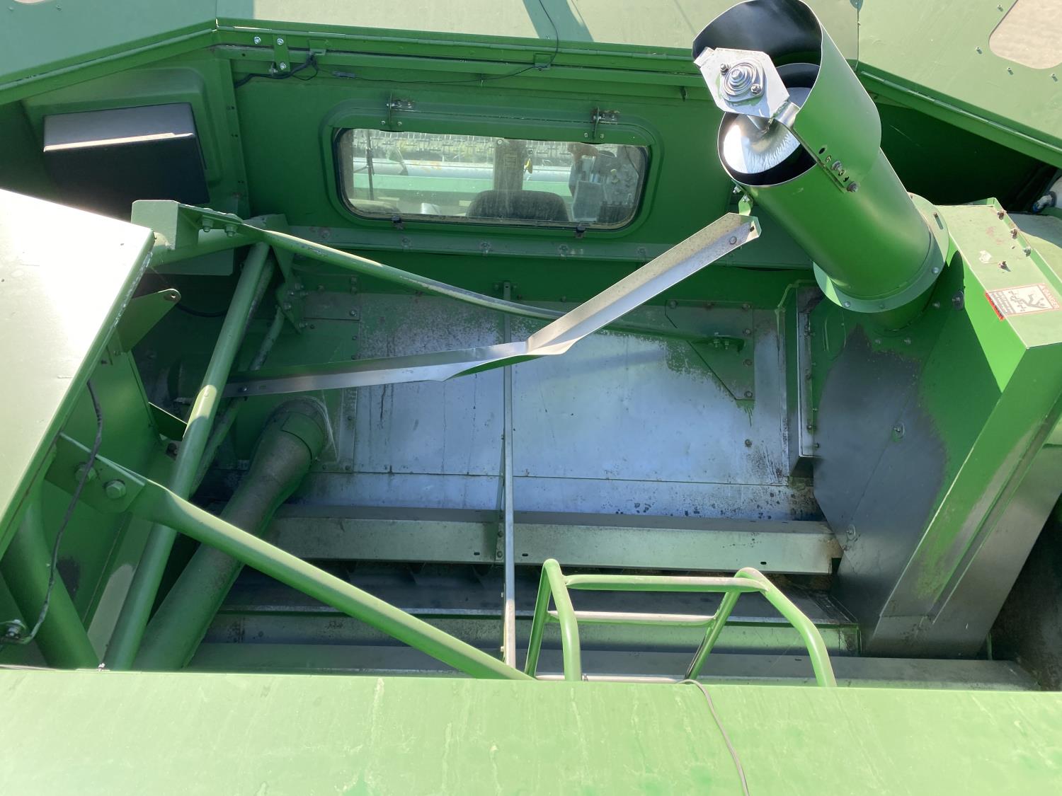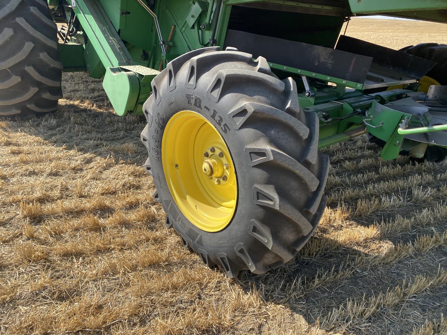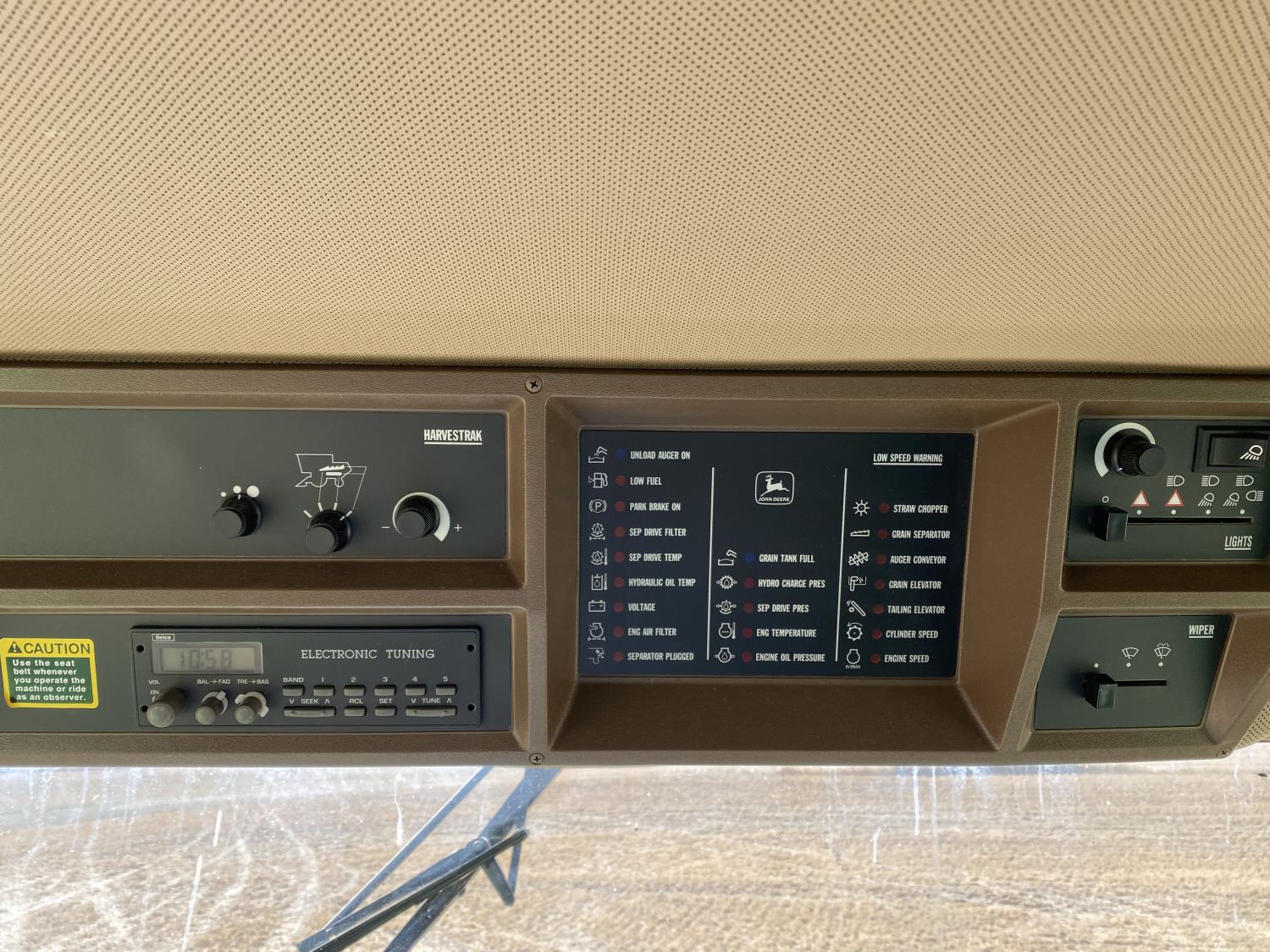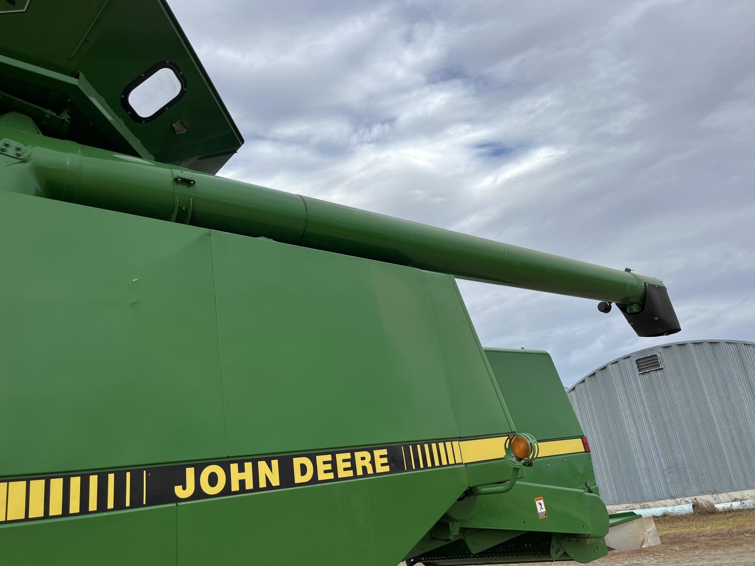1998 John Deere 914 14 ft pick-up header, variable speed reel, fore & aft, reverser, rock trap, chaff spreader, fine cut chopper/spreader, grain tank extensions, 18 ft auger, A/C, buddy seat, 30.5-32 front tires, 16.9-26 rear tires
