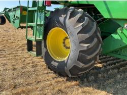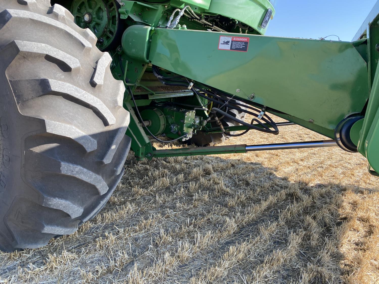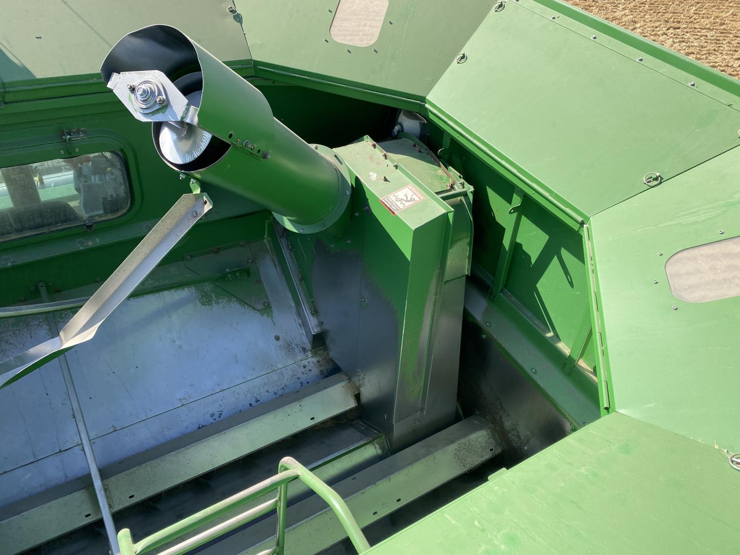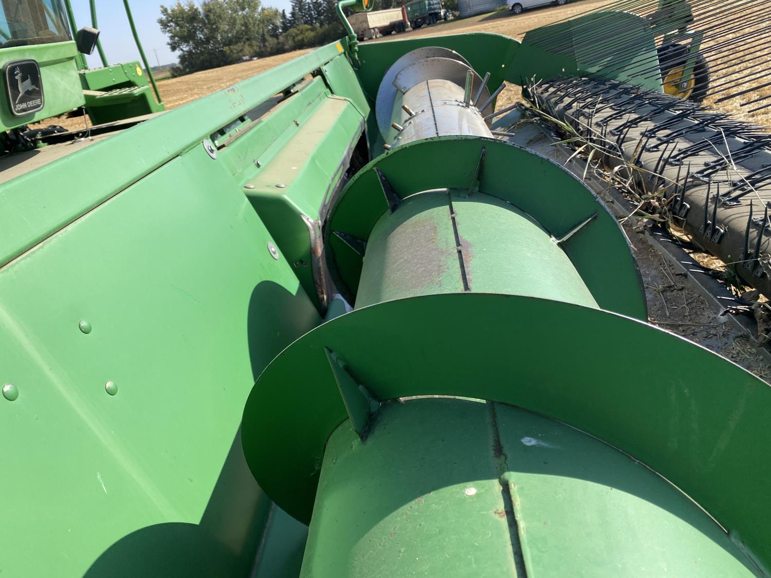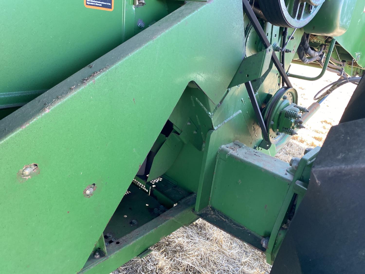 1998 John Deere 914 14 ft pick-up header, variable speed reel, fore & aft, reverser, rock trap, chaff spreader, fine cut chopper/spreader, grain tank extensions, 18 ft auger, A/C, buddy seat, 30.5-32 front tires, 16.9-26 rear tires