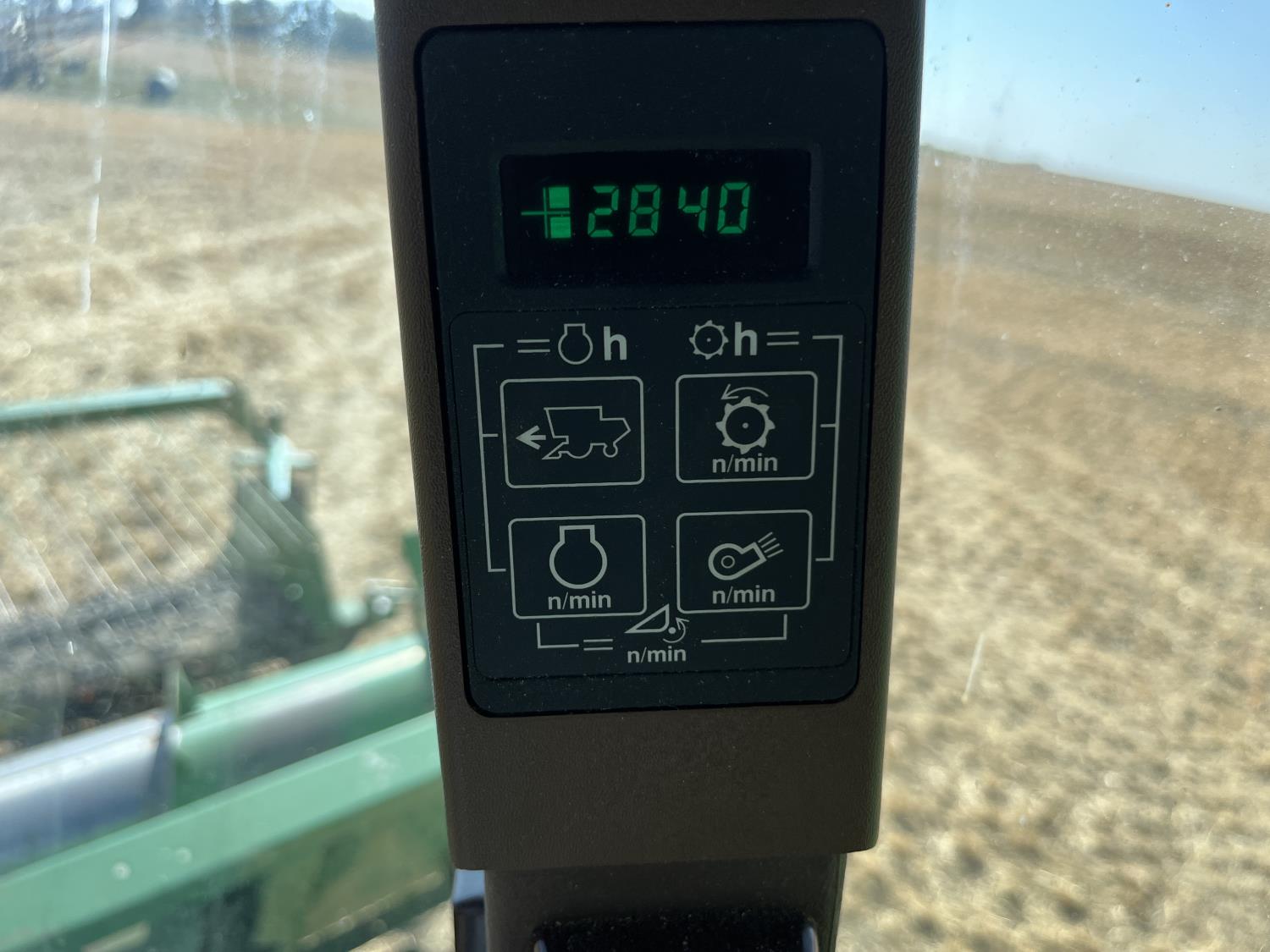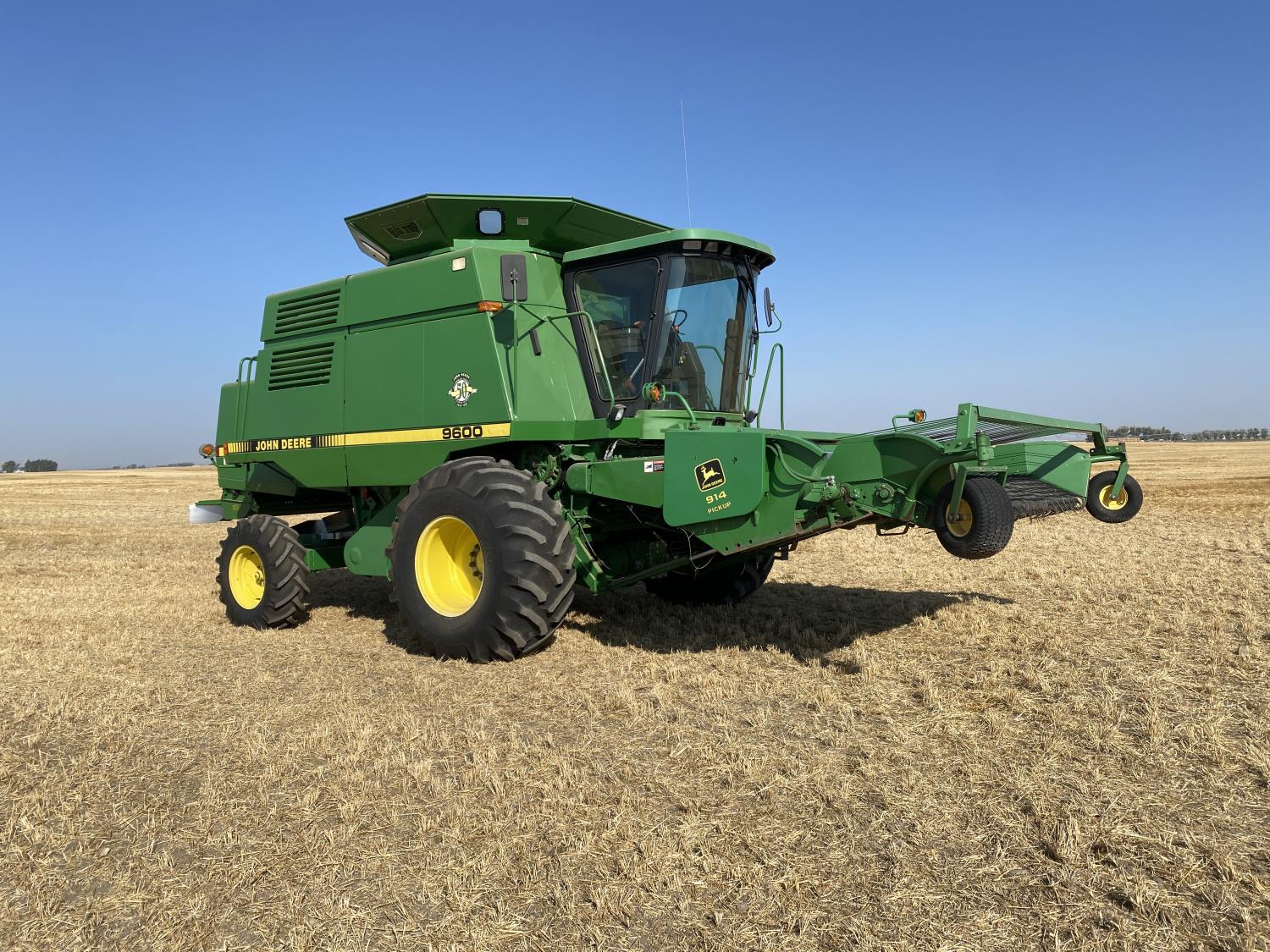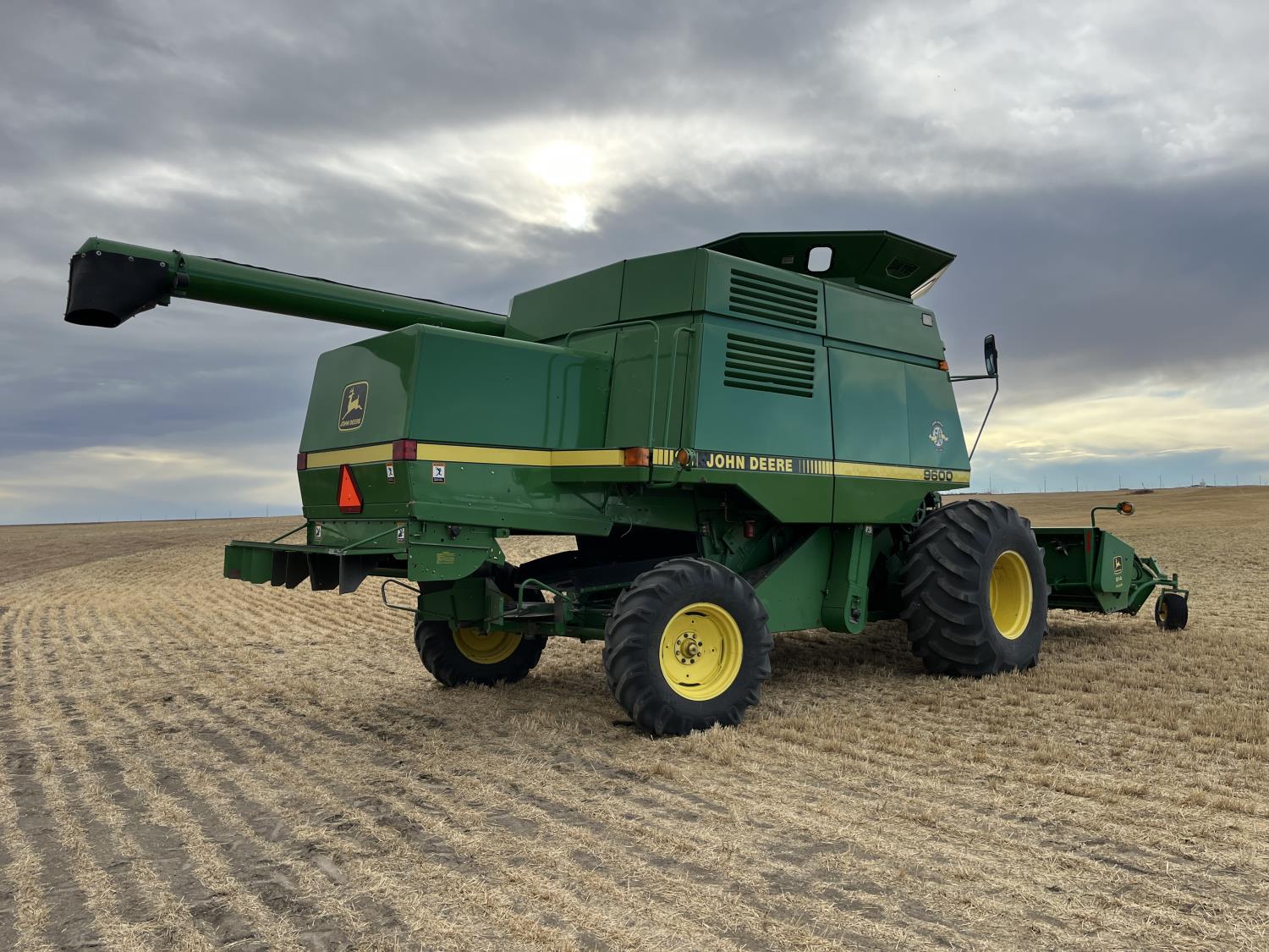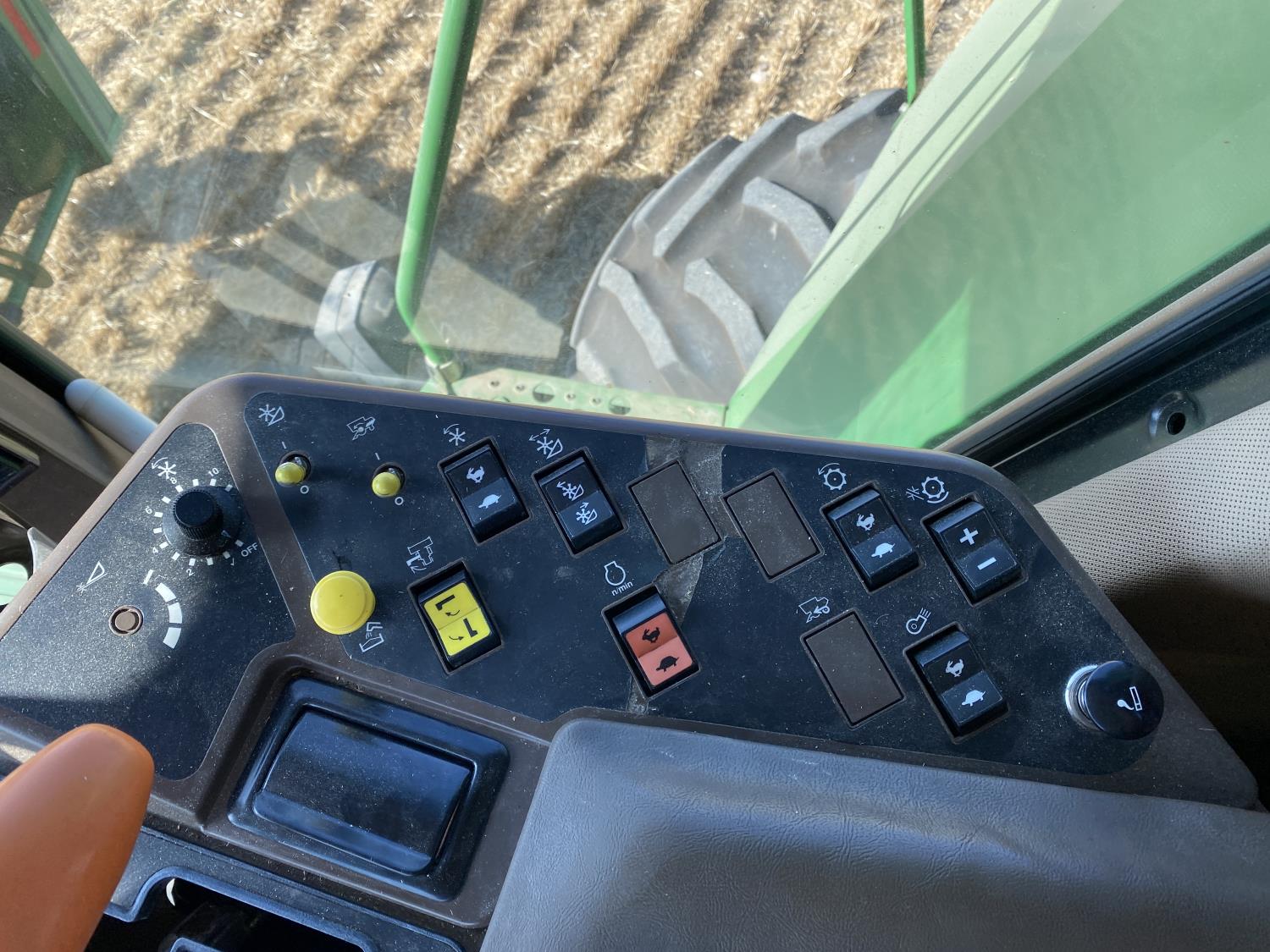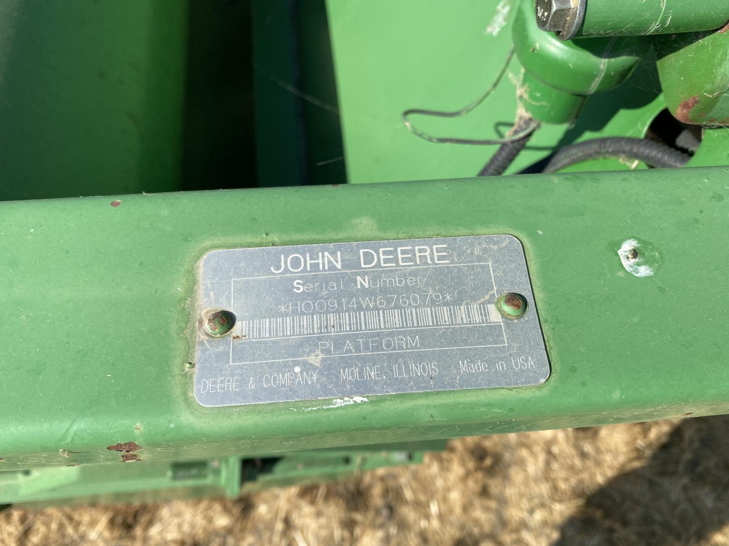 1998 John Deere 914 14 ft pick-up header, variable speed reel, fore & aft, reverser, rock trap, chaff spreader, fine cut chopper/spreader, grain tank extensions, 18 ft auger, A/C, buddy seat, 30.5-32 front tires, 16.9-26 rear tires