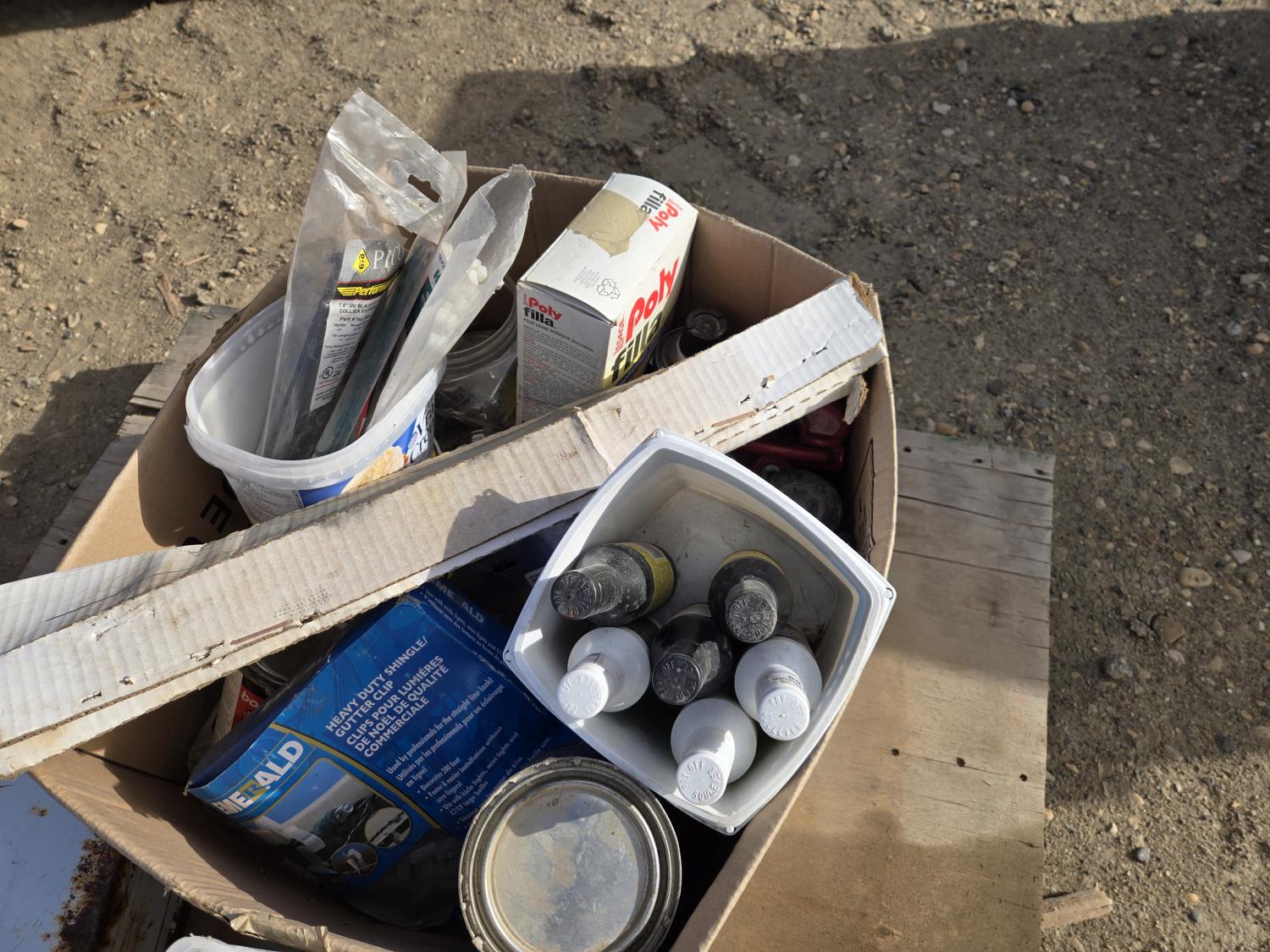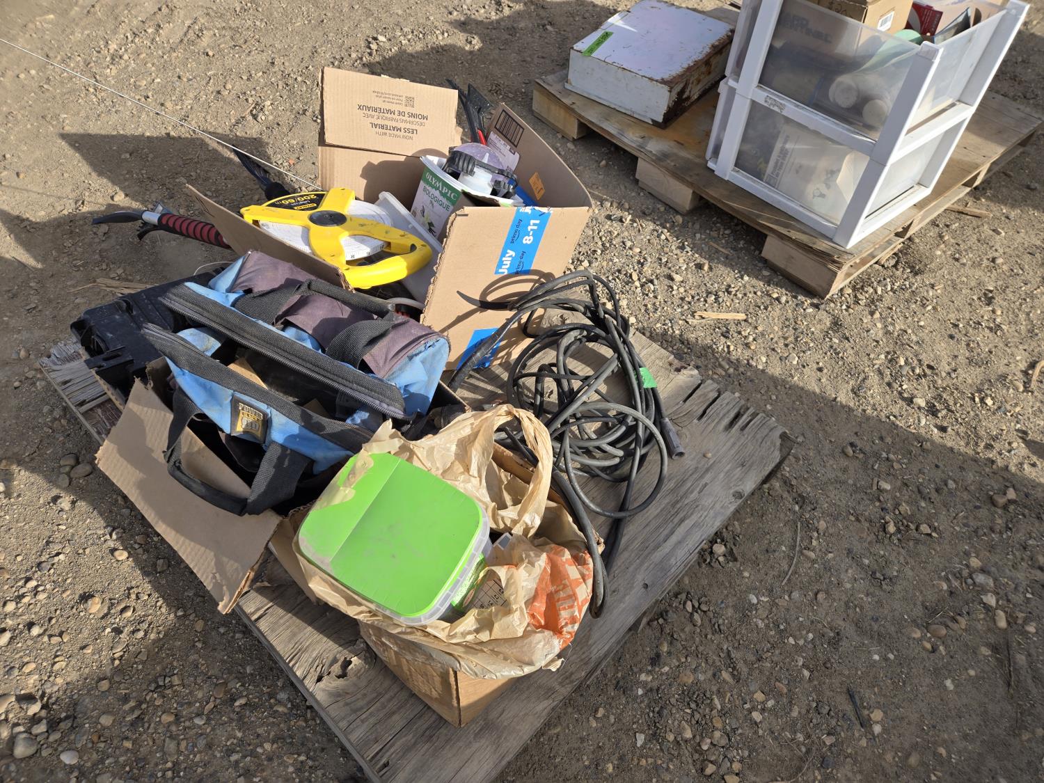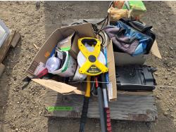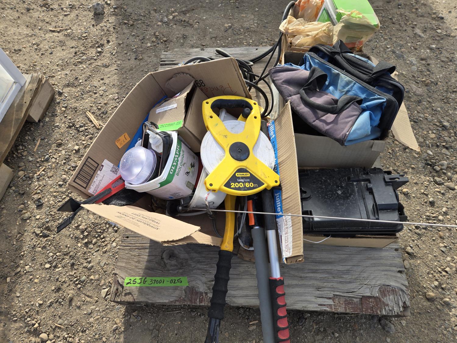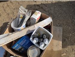 Painting supplies, first aid kit, long reel tape measure, snow brushes, paint sprayer, miscellaneous items