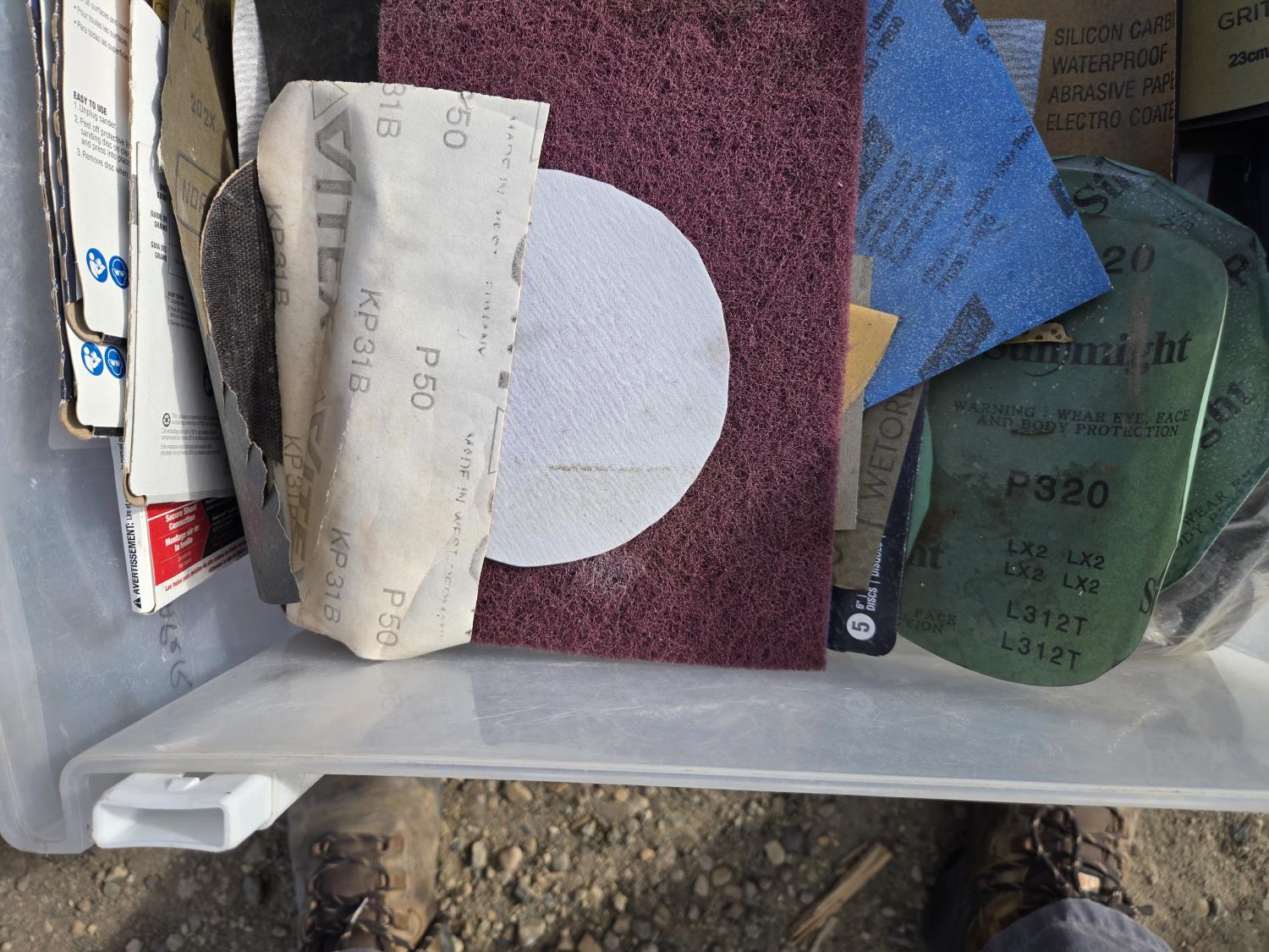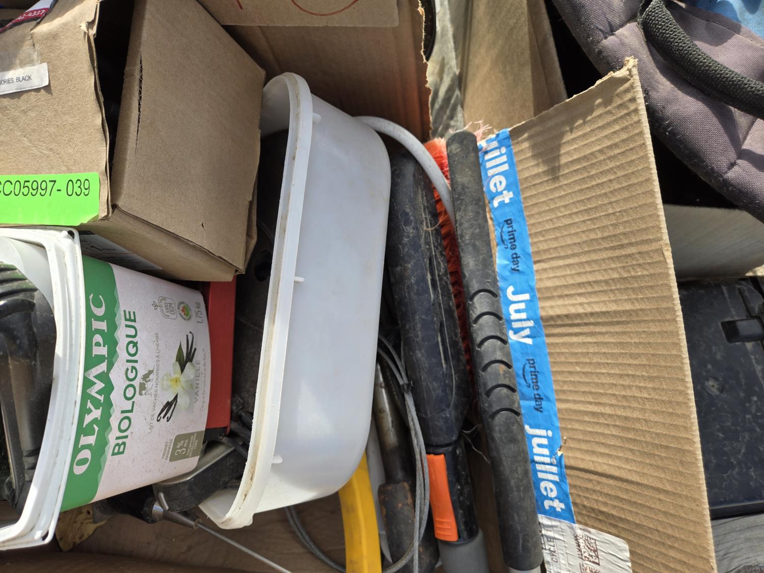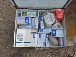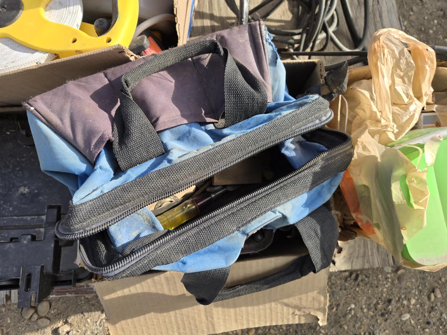 Painting supplies, first aid kit, long reel tape measure, snow brushes, paint sprayer, miscellaneous items