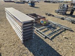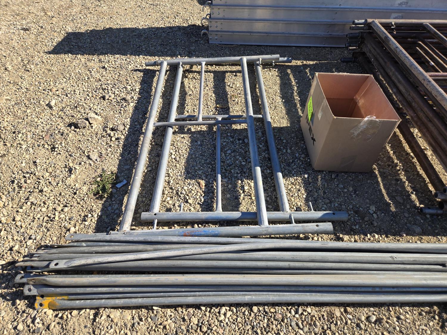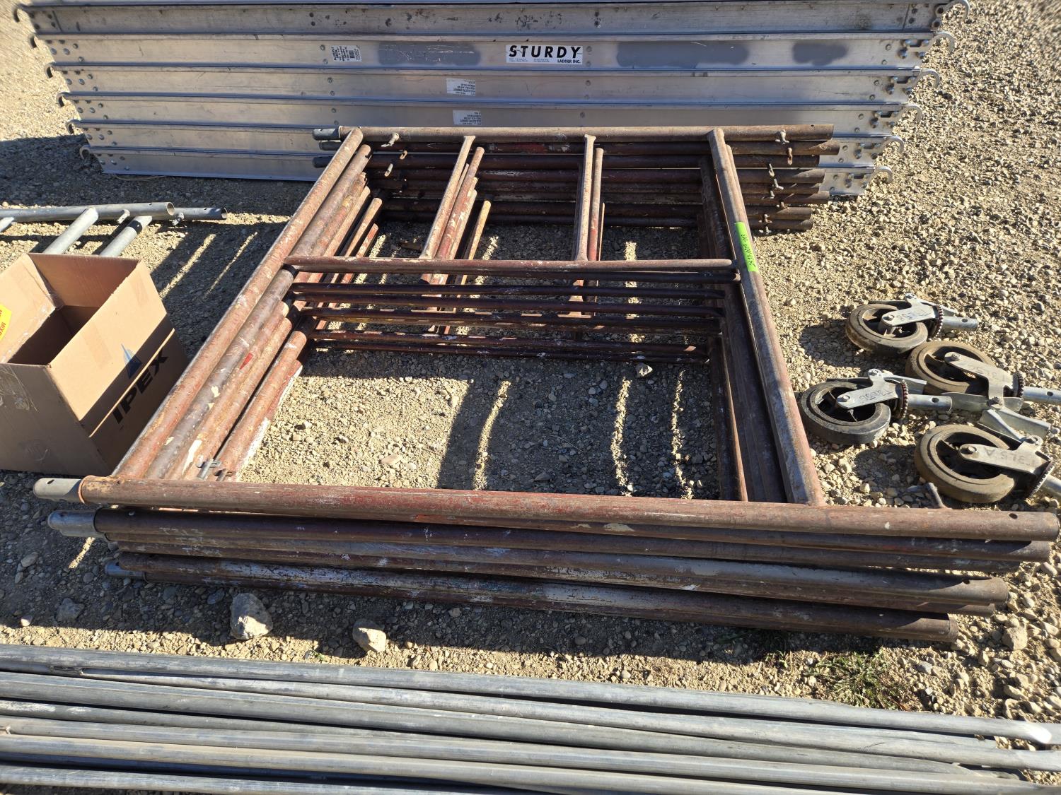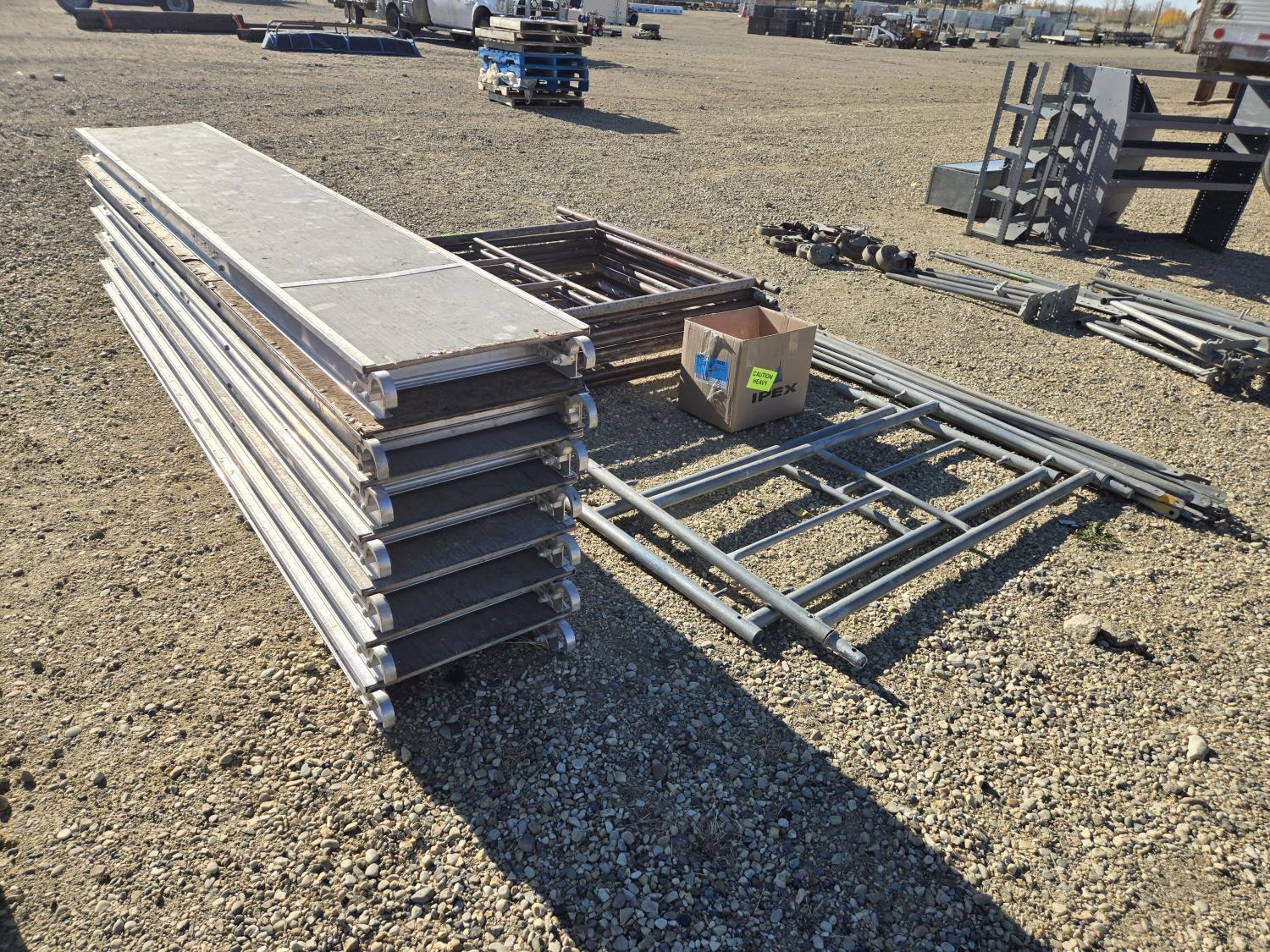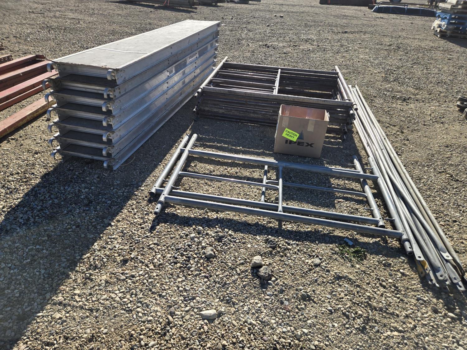 (4) casters, braces, (7) 10 ft aluminum scaffold planks, (8) 5 ft scaffold end frames, qty of connectors, (2) 3 ft scaffold end frames