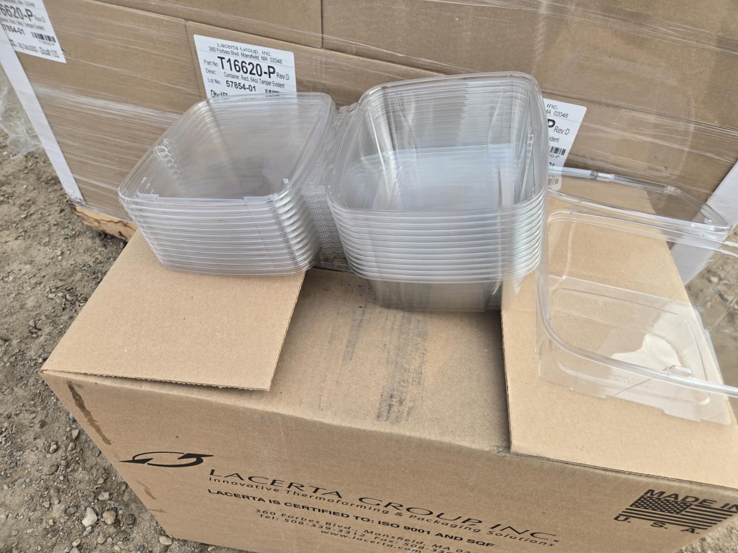 7396 (25) Boxes of Lacerta 64 oz Tamper Evident Plastic Food Containers (Unused)