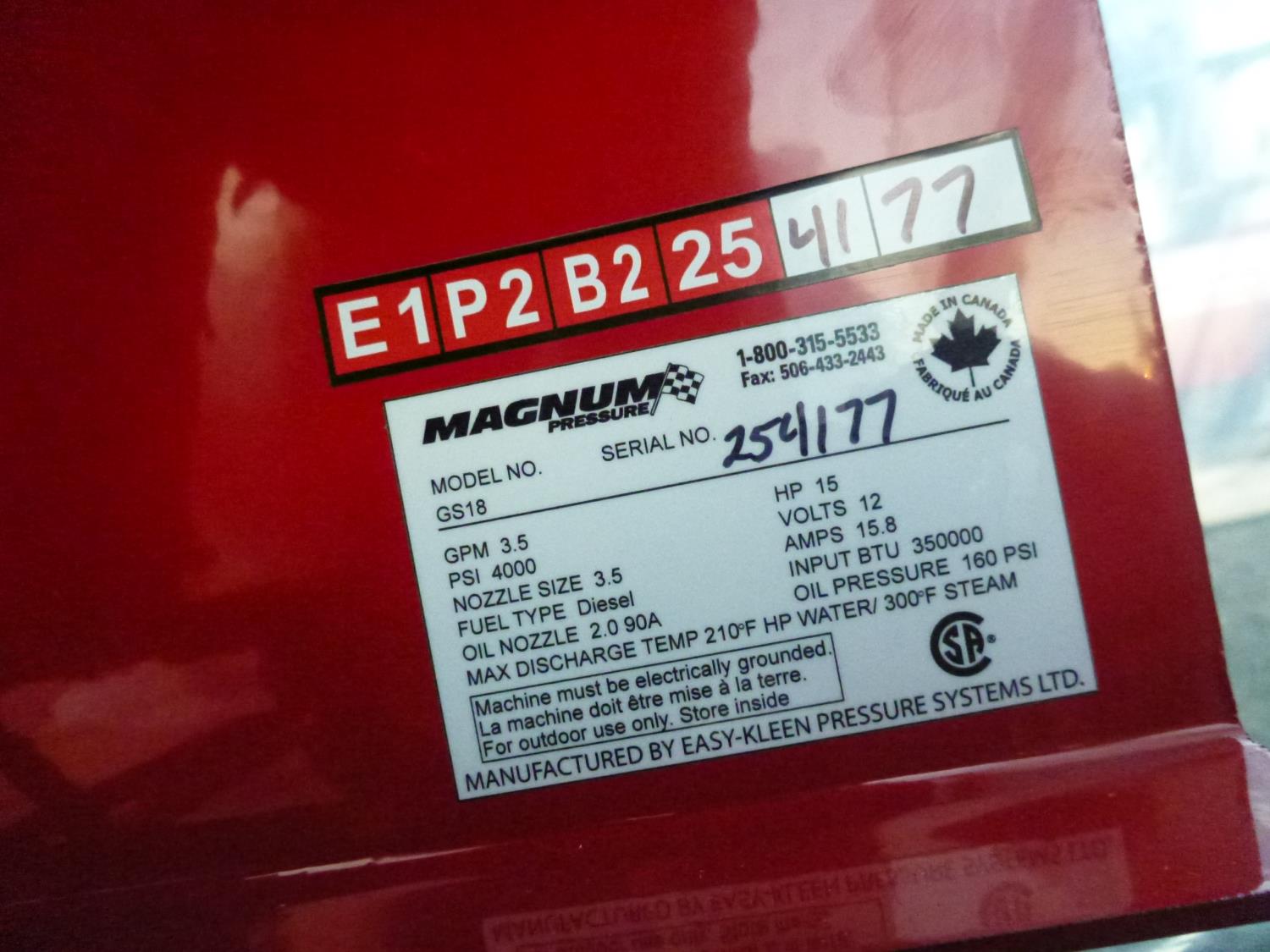 3.5 GPM at 4000 PSI, 15 HP, gasoline engine, electric start, 12 volt burner, oil/diesel fired burned/thermostat, schedule 80 coil with stainless steel housing, fully welded, powder coated frame, 10 gallon poly fuel tank, 30 ft hose and wand