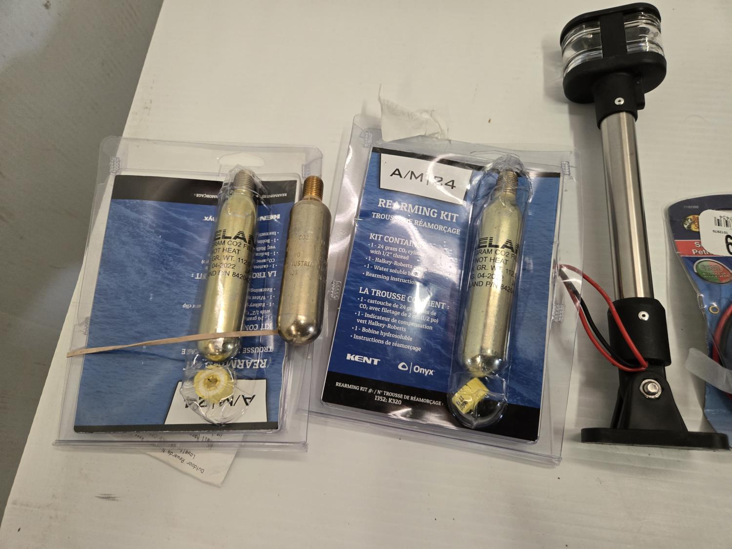 (3) CO2 cylinders, boat light, wallet, fishing float, caps, cross bow bolts, miscellaneous items, power pedestal, Bass Pro Shop Return, Items are sold as is and may have defects or missing parts, Personal inspection is advised