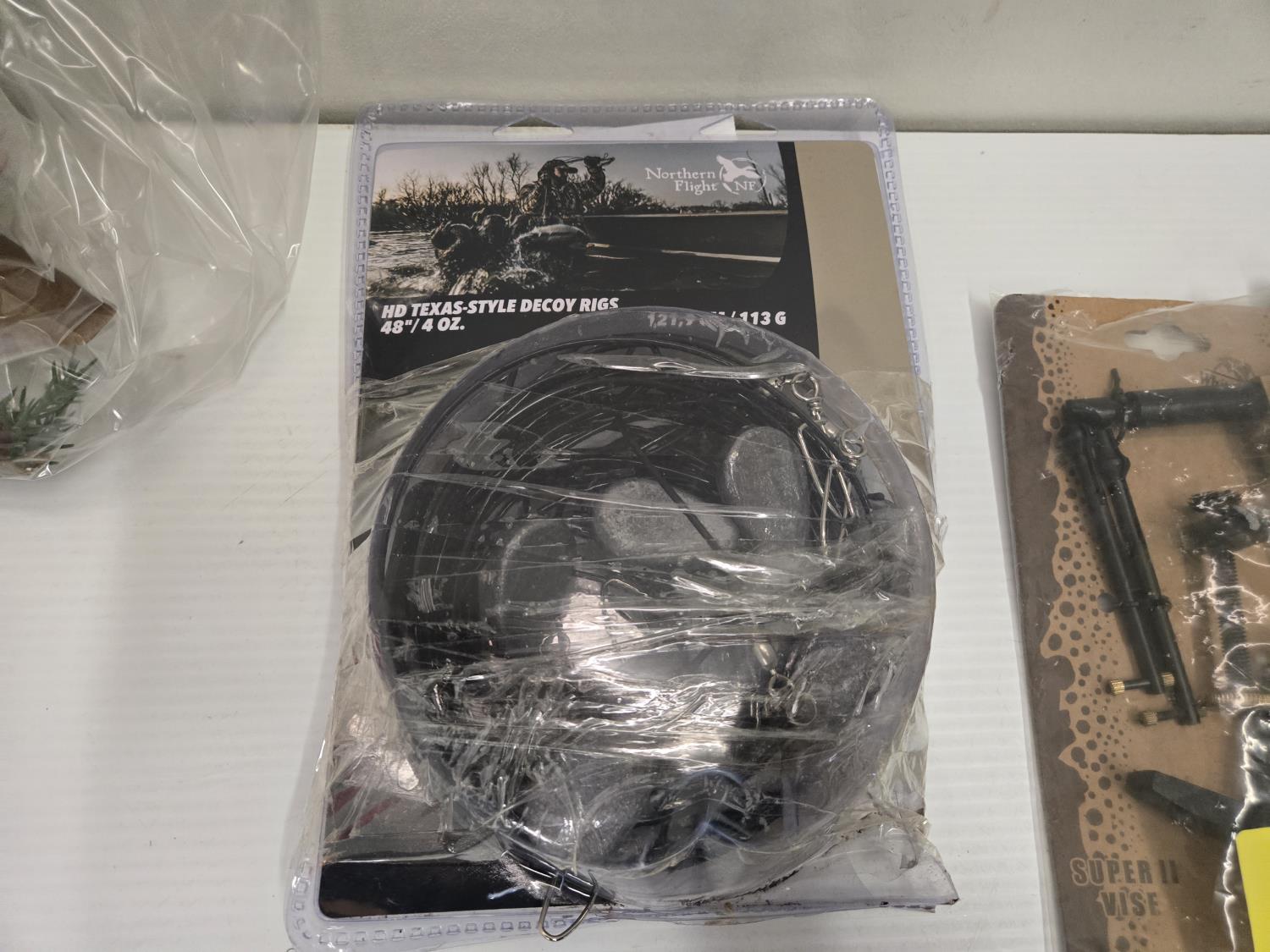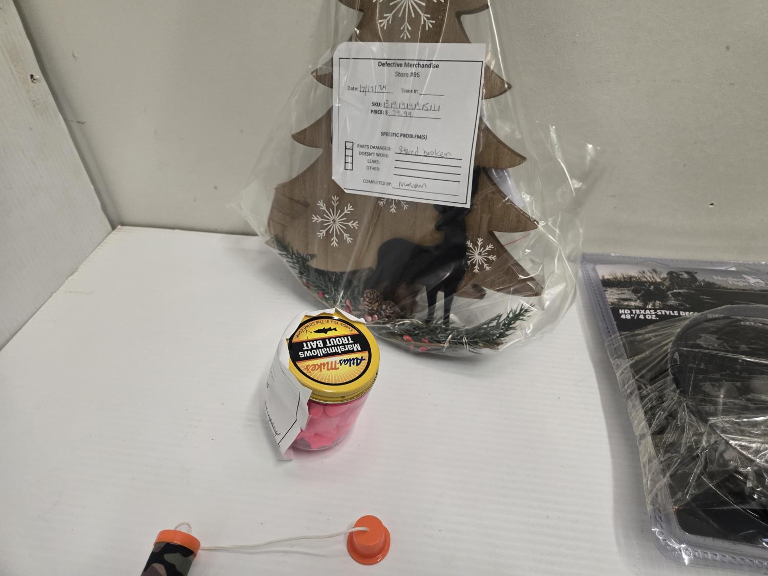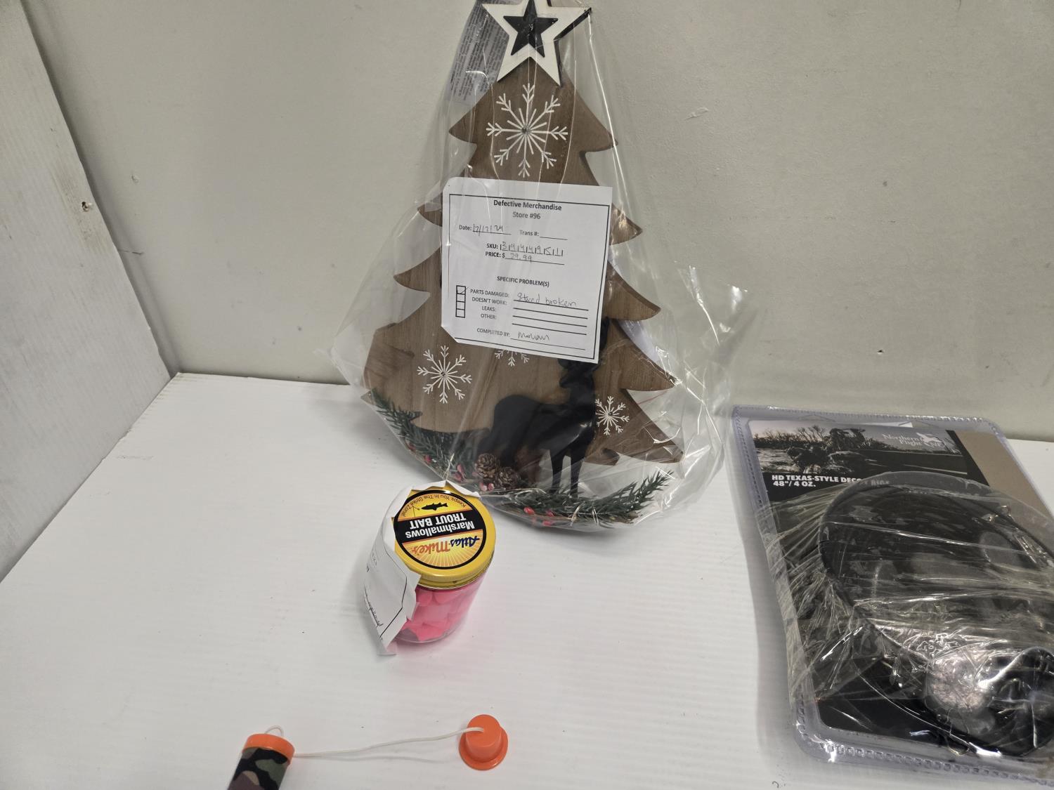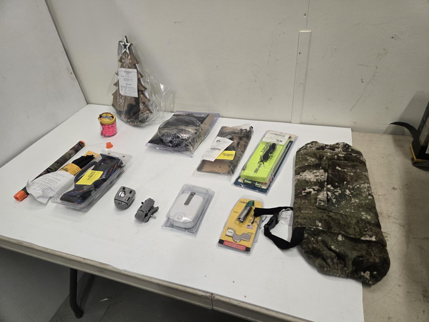 Choke tube, dog jacket, decoy rigging, (2) line locks, fish bait marshmallows, Christmas tree ornament, board with strike flag, Bass Pro Shop Return, Items are sold as is and may have defects or missing parts, Personal inspection is advised
