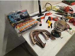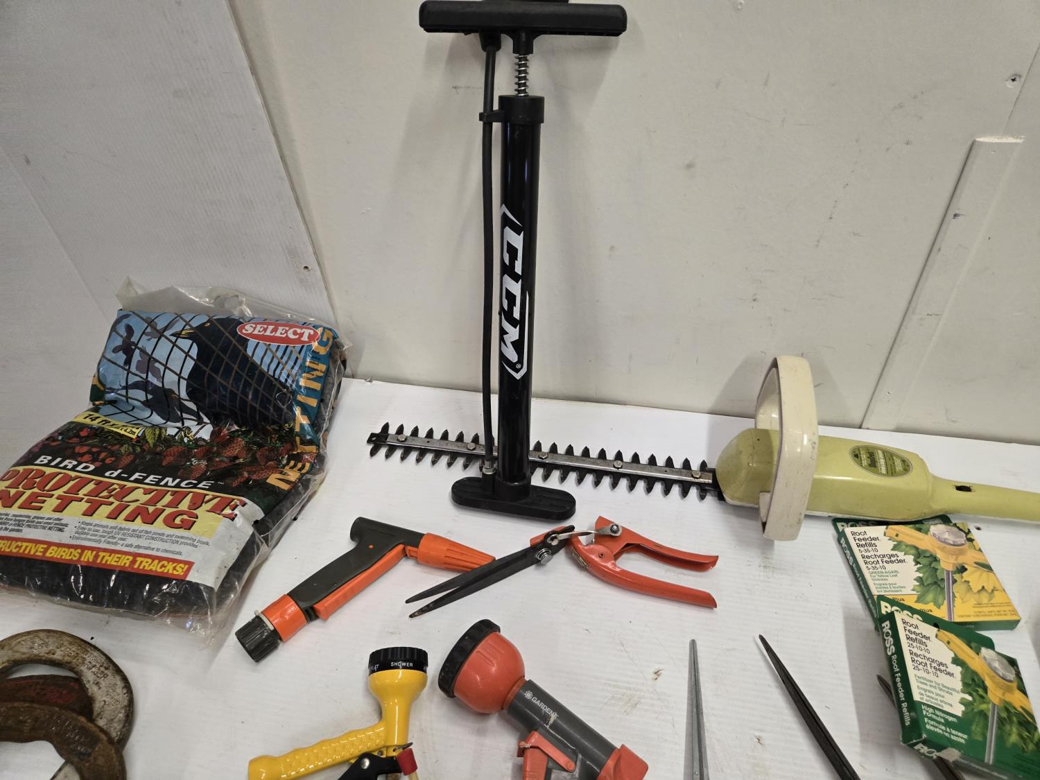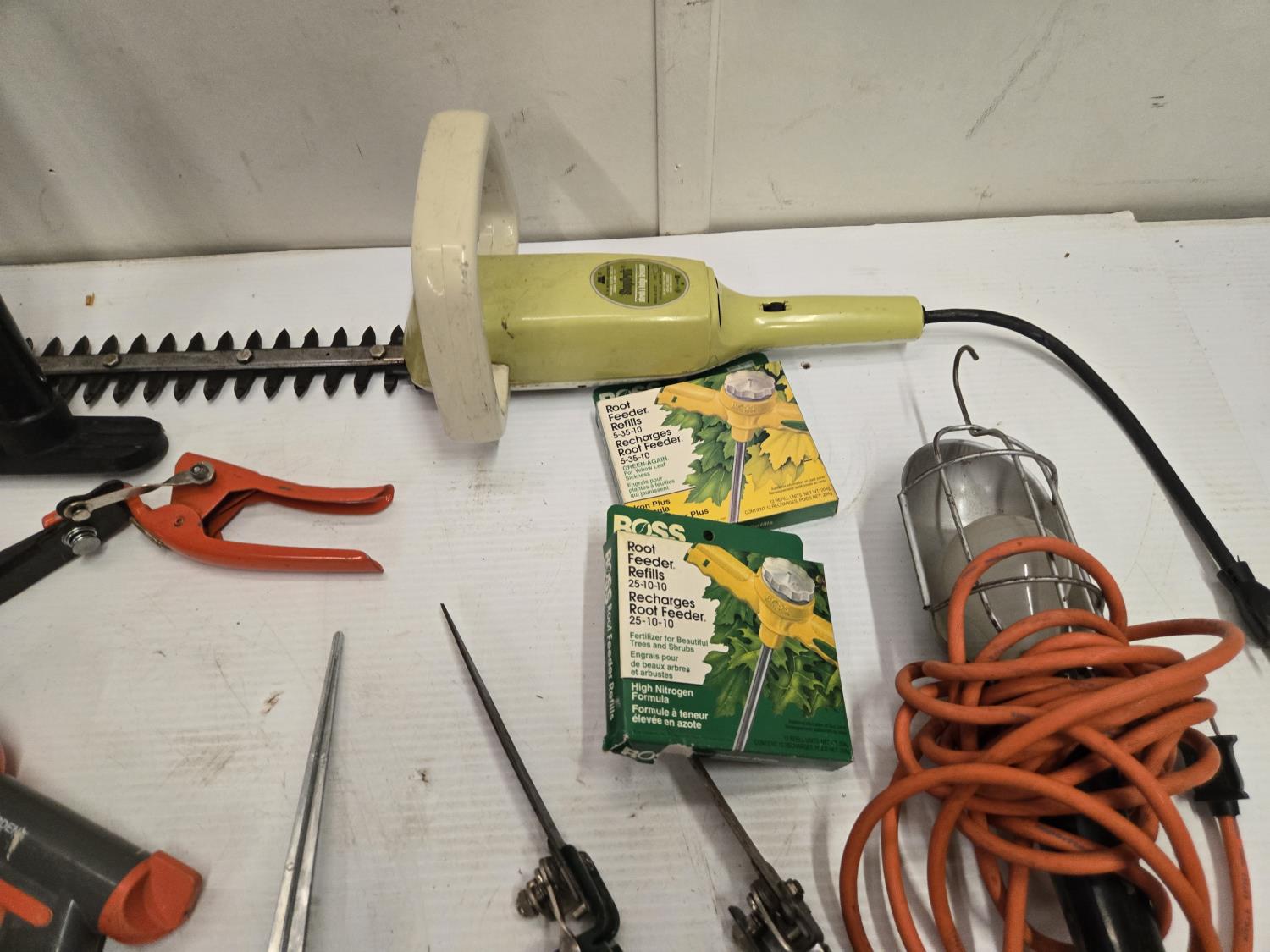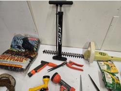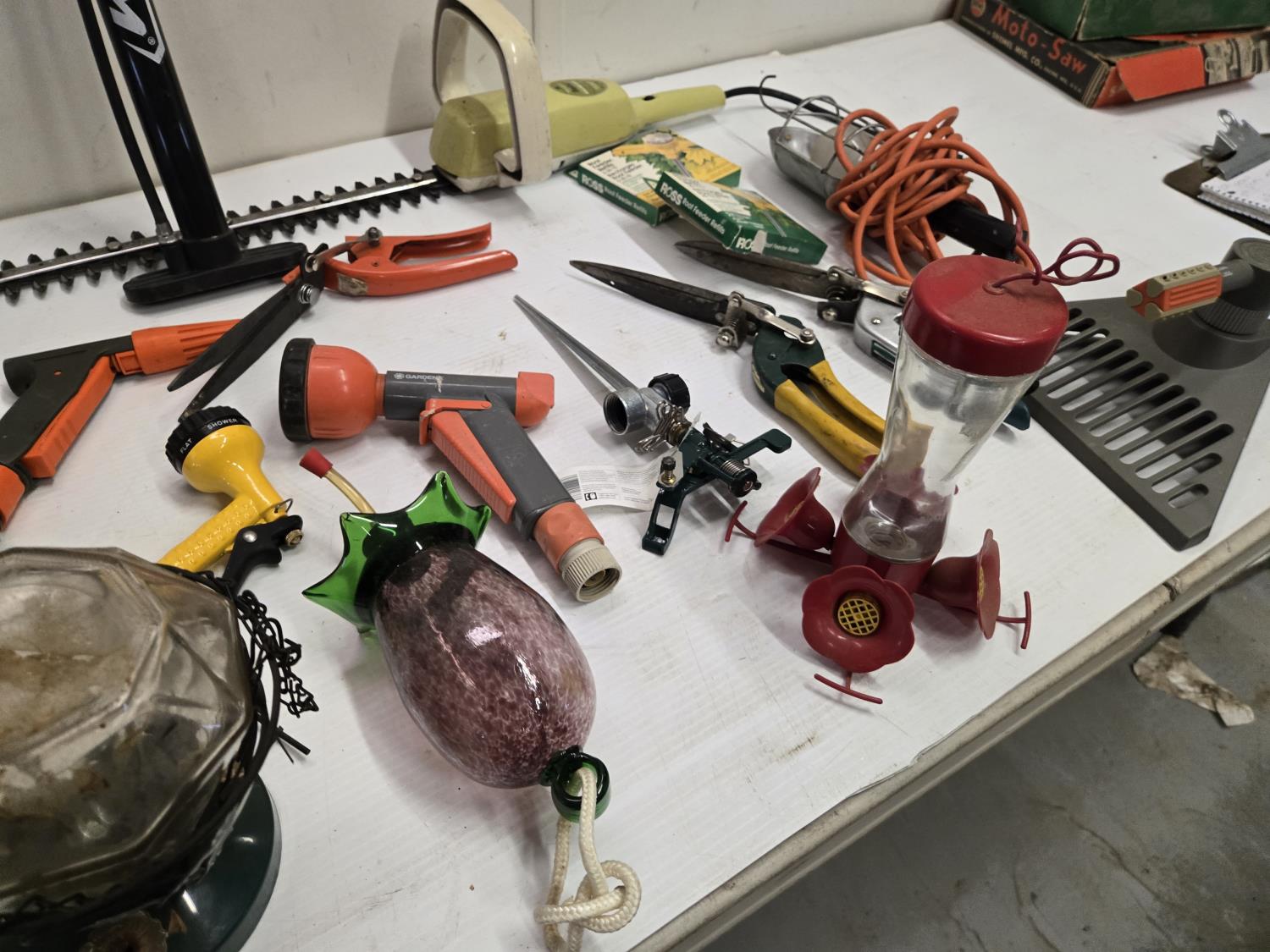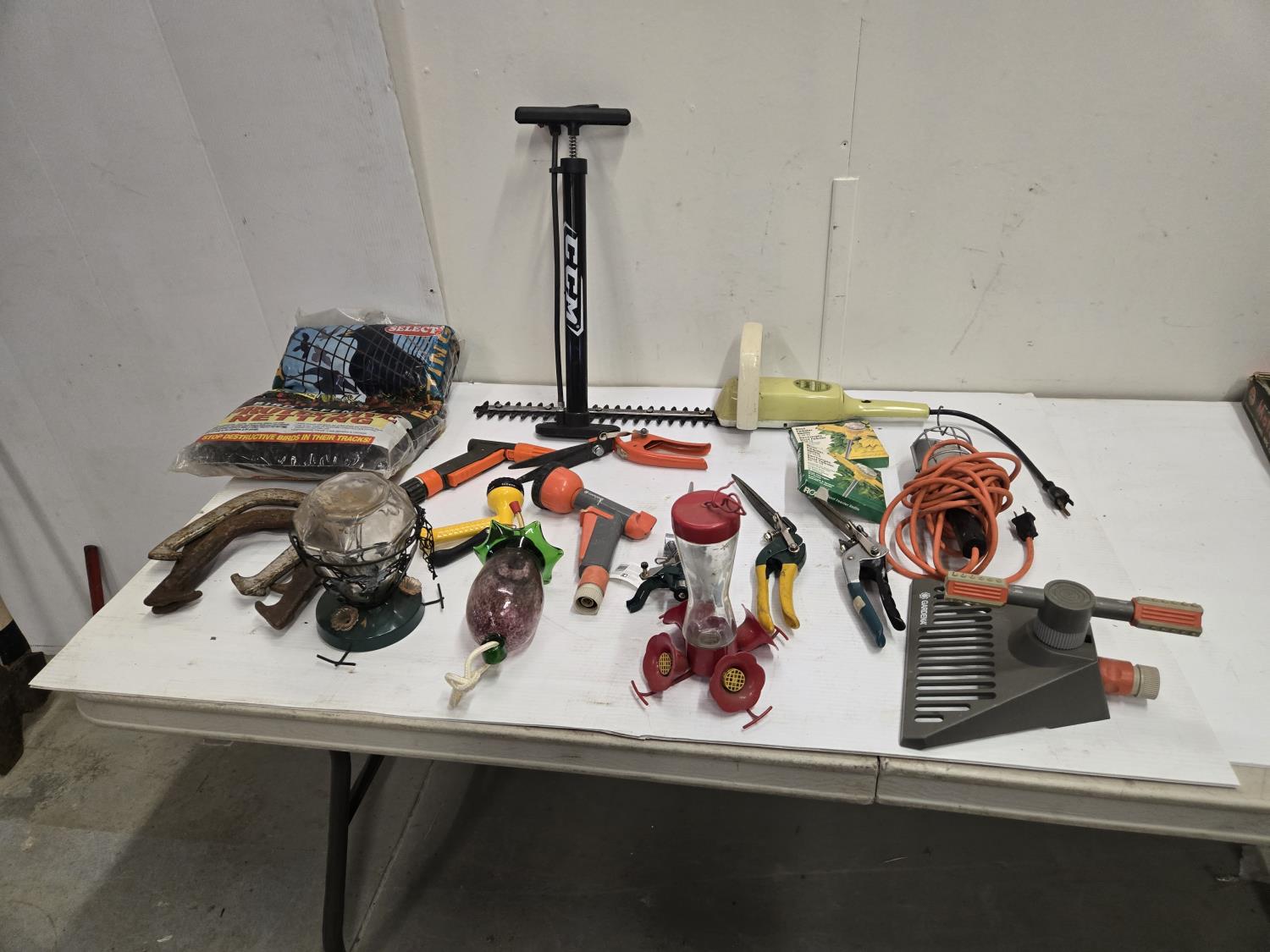 Electric hedge clippers, (3) garden hose nozzles, (2) sprinkler heads, (3) hummingbird feeders, trouble light, () horse shoes, tire pump