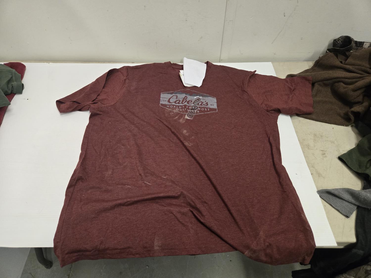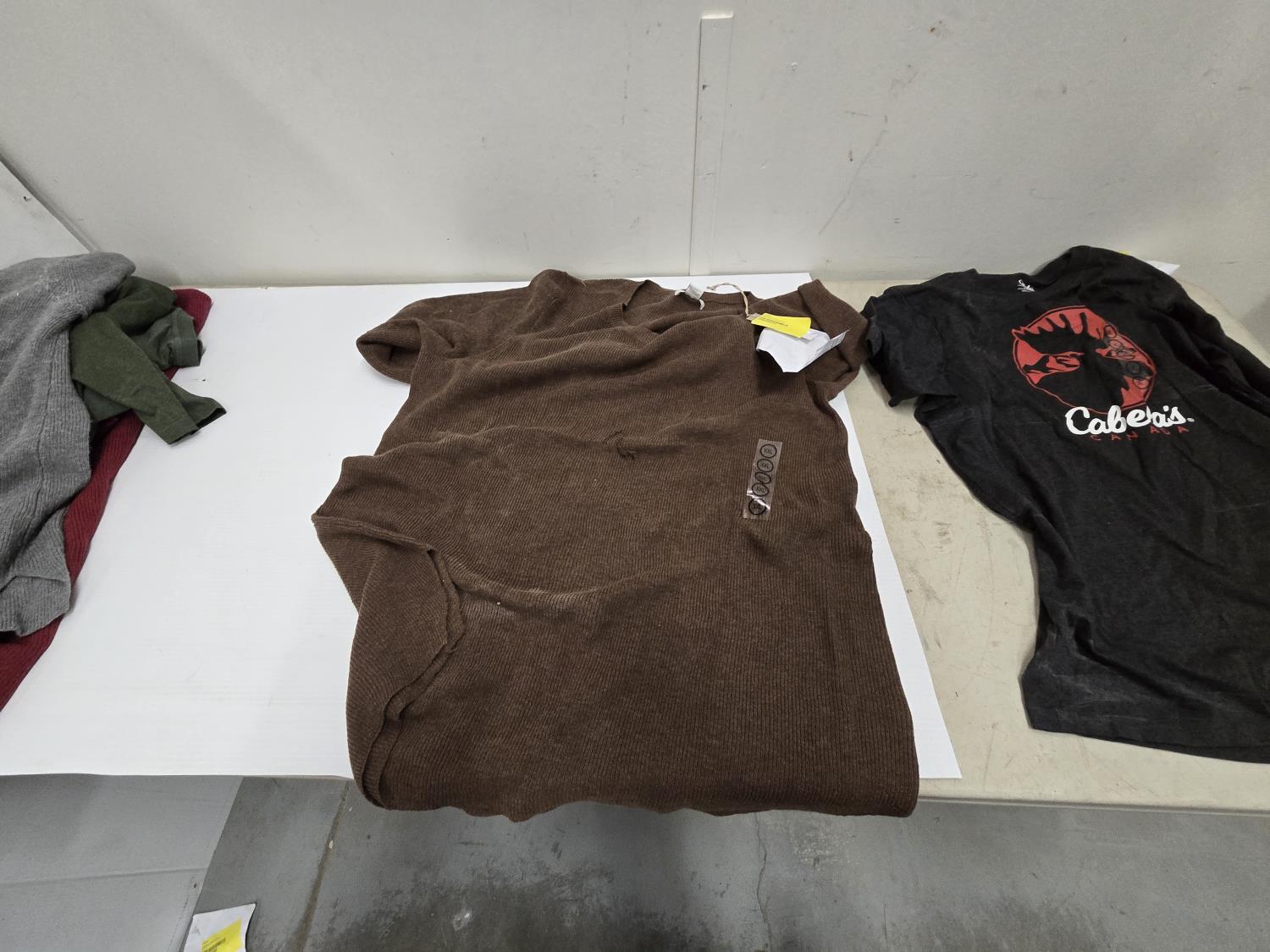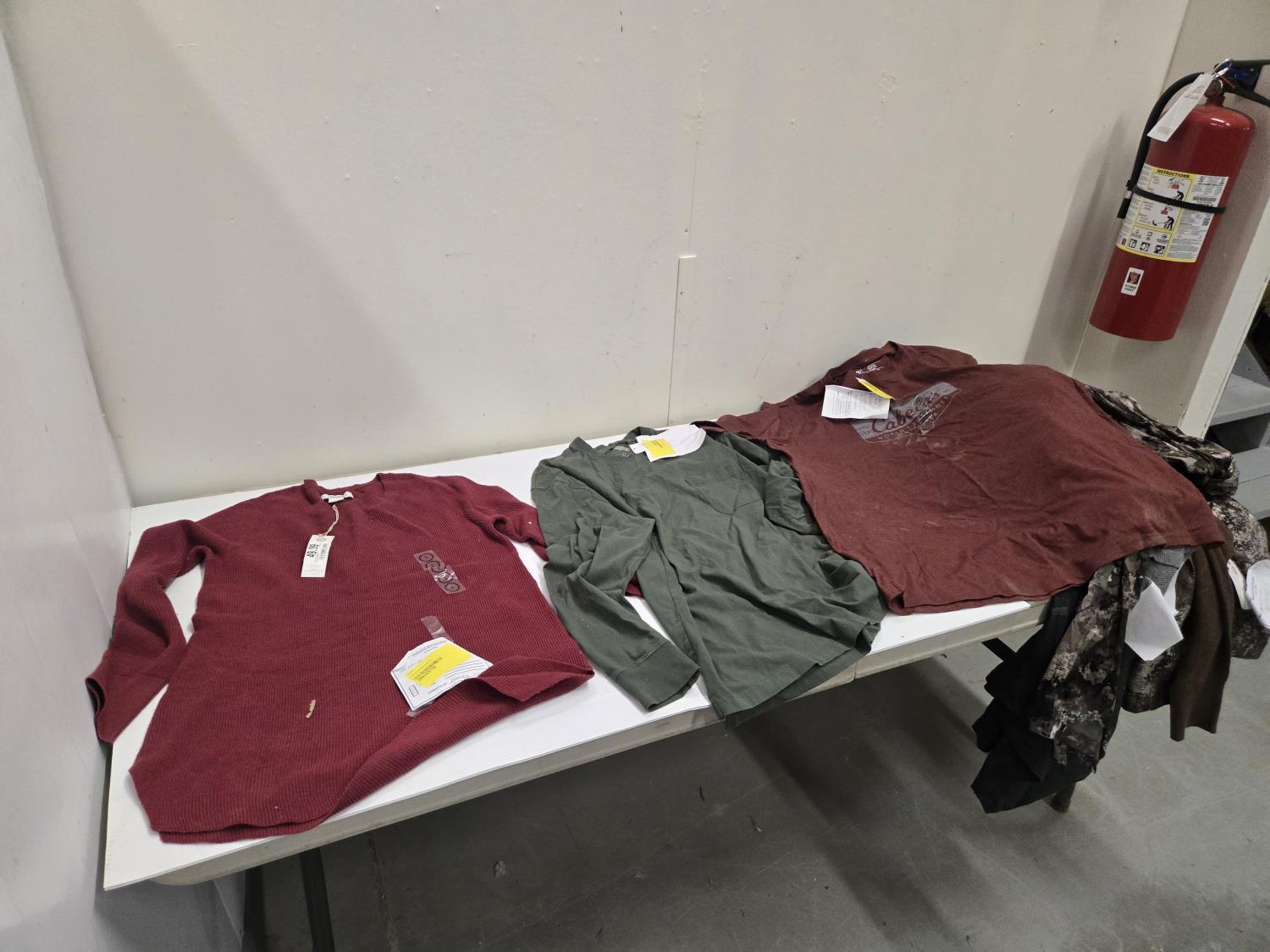 (2) small sweaters, (1) L tee shirt, (1) XL tee shirt, (1) 3XL tee shirt, (1) 2XL tee shirt, (1)XL sweater, Bass Pro Shop Return, Items are sold as is and may have defects or missing parts, Personal inspection is advised