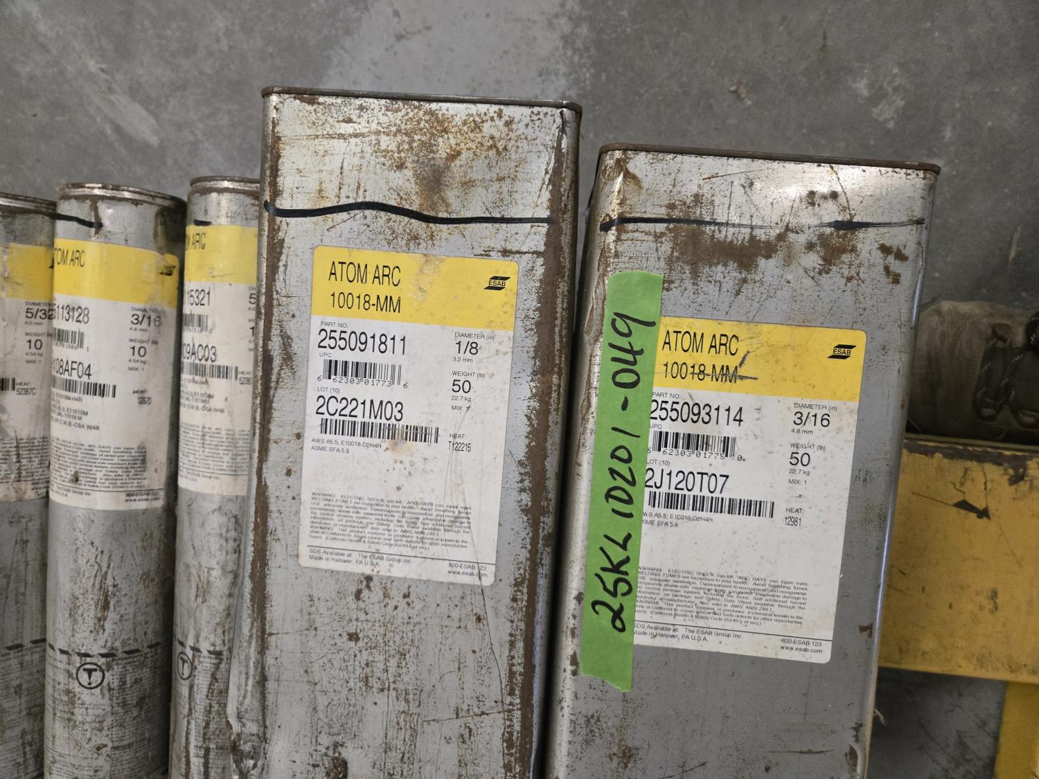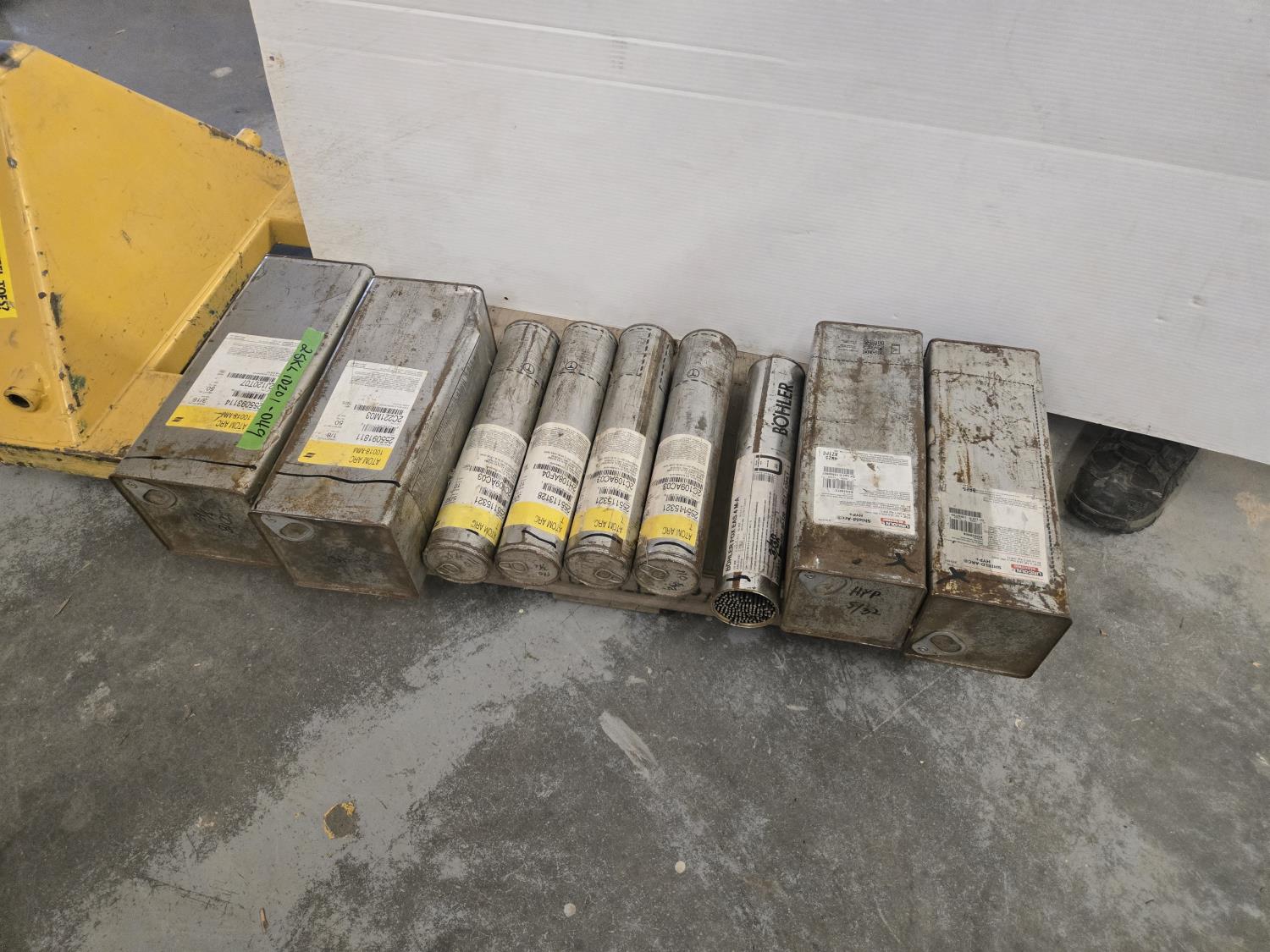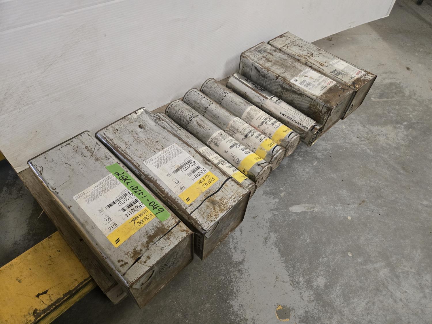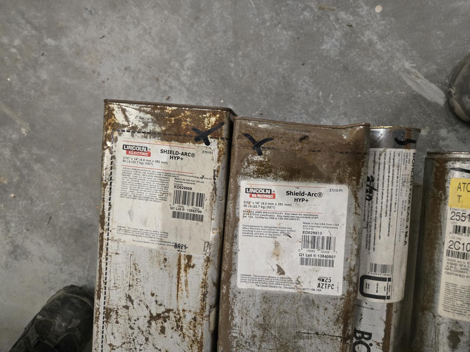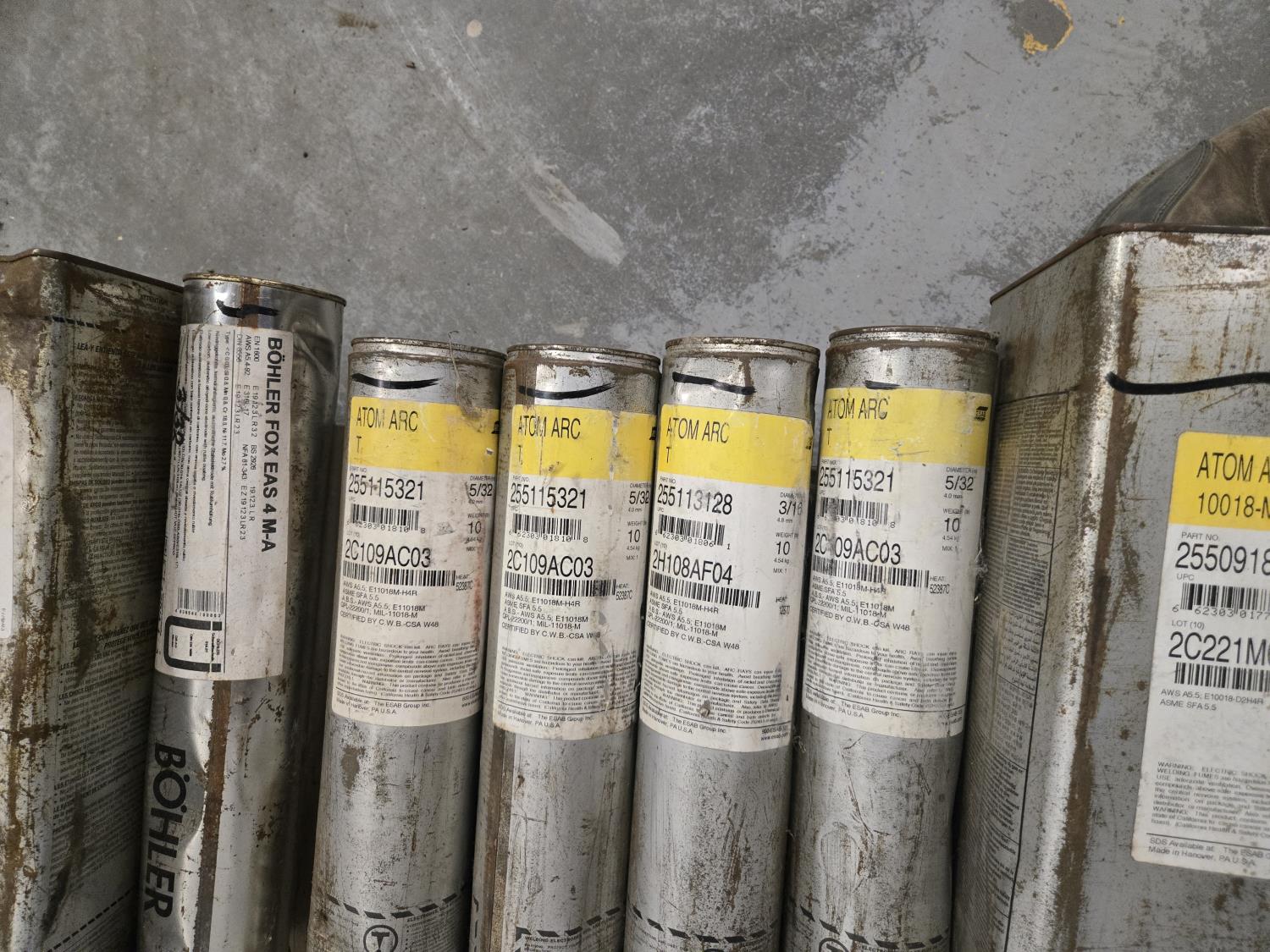 (2) 50 lb boxes of Atom Arc 3/16 & 1/8, (3) Atom Arc 10 lb 5/32 #255115321, (2) 10 lb 3/16 inch welding rods, (2) Fleetwood Shield Arc HYP+ 50 lb Boxes (1) 3/16 & (1) 5/32
