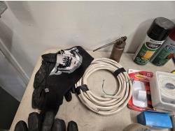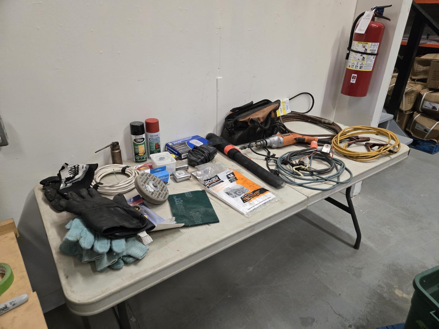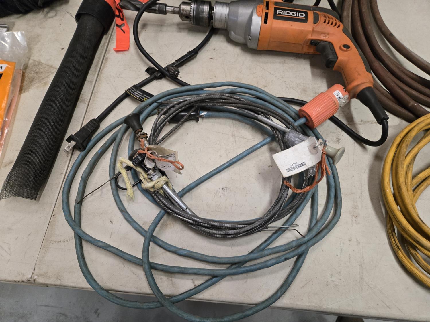7346 Ridgid 1/2 Inch Corded Drill, Booster Cables, Gloves, Misc Shop Supplies