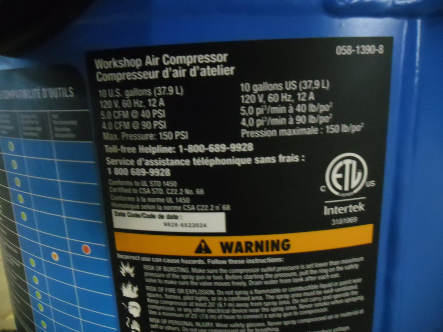 5162 Mastercraft 10 Gallon 150 PSI Air Compressor