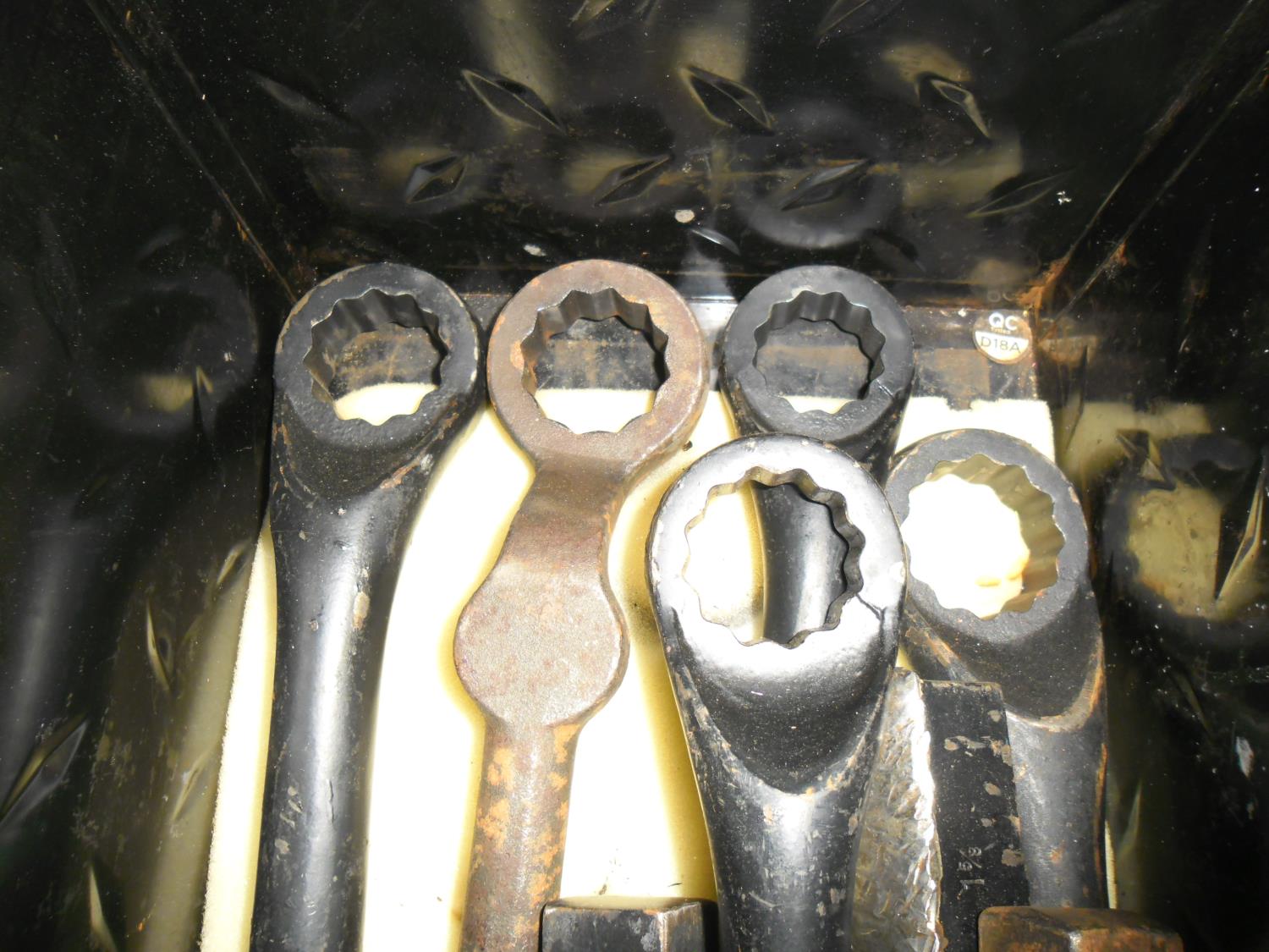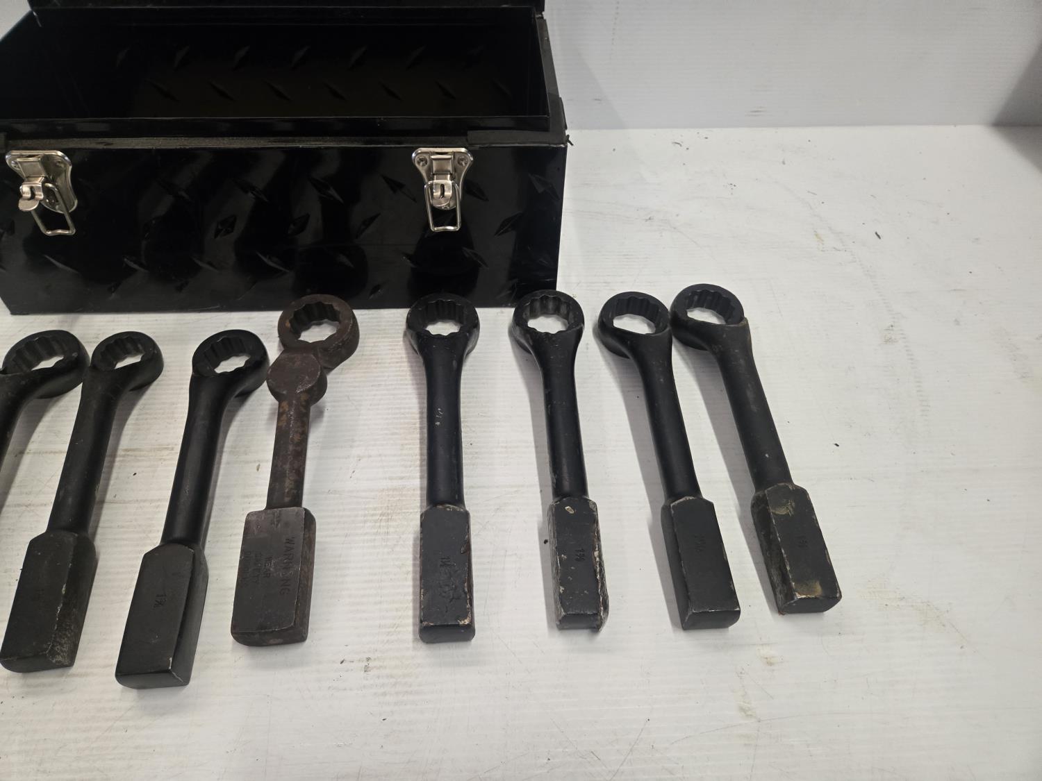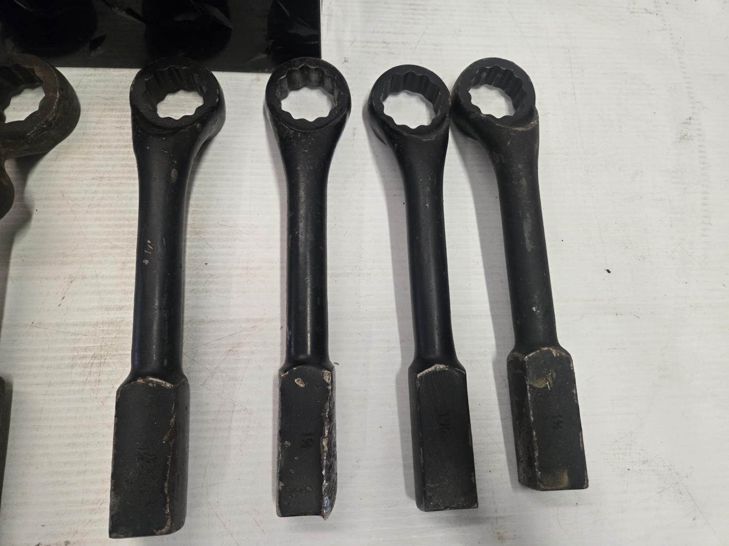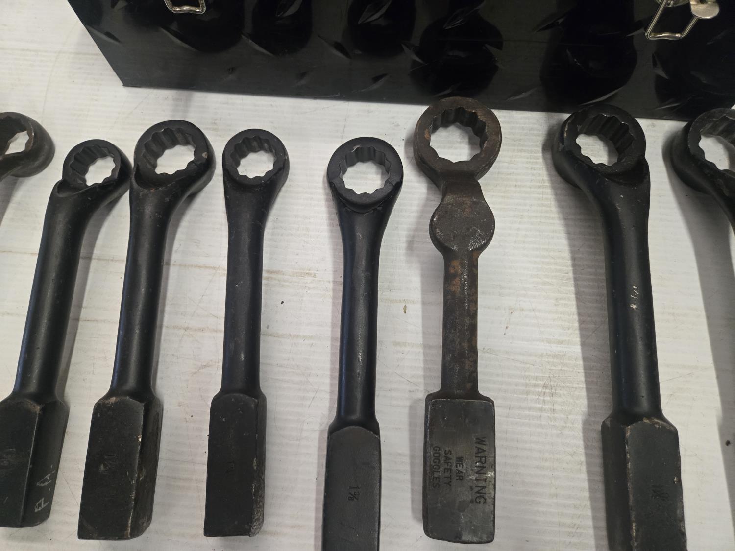 11 striker, comes with toolbox, sizes, 1-1/8 inch, 1-3/16 inch, 1-1/4 inch, 1-3/8 inch, 1-7/16 inch, 1-1/2 inch, 1-9/16 inch, 1-5/8 inch (2), 1-11/16 inch, 1-15/16 inch