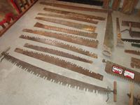 scythes, axes, broad axe, saws, grub hoes, picks, boomers & misc tools