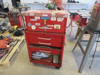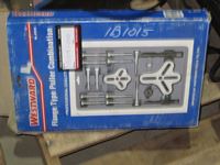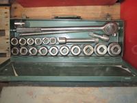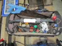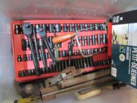 tote w/pliers, coping saw, hand planner, ratchet & socket set, clamps, allen keys, tap & dye set