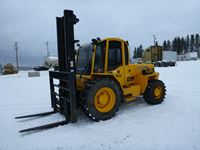 4.4 L JCB turbo diesel engine, (4) speed power shift transmission, 4' long forks with hyd adjustment to 6' wide, 15.5x25LS front tires, 14x17.5NHS rears, enclosed cab with heat, 169" max height, 124" lowered height, 9,248 hours
