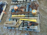 60 Pallet with (1) Come Along, (1) Tow Strap, (3) Pick Axes, (2) Chain Hoists