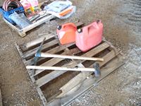 29 Pallet with Pick Axe, Sledge Hammer, Jerry Cans