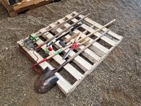 399 Pallet of Misc Garden Tools, Shovels, Rake, Scissors, Axe, Hoe & Misc
