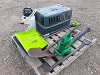 480 Pallet of Shovels, Pet Crate, Leaf Blower & Chemical Sprayer