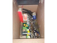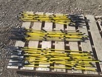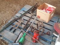 cattle prods, calf dehorner, post hole digger, dirt scoop, 12 ton jack, box with 5 heat lamps, clevises & pins