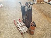 252 Pallet Of (2) Golf Clubs, Sled, Boothorn, Muskrat Trap & Copper Pump Fire Extinguisher
