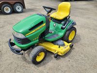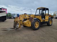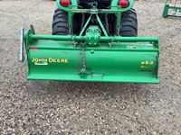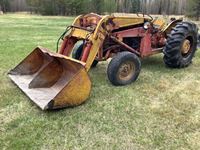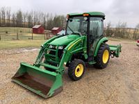 JD 300CX loader, Q/A bucket, grill guard, joystick, hydro transmission, cab, A/C, heat, radio, 3 pt hitch, rear hydraulic coupler, 540 pto, c/w 3 pt quick attach hitch, only 596 hrs