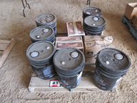(6) pails of Duron HP 15W40 motor oil, (4) 4 litre jugs of 15W40 motor oil and ((24)1 litre 5W30 motor oil, (1) pail of Traxon 80W90 hypoid gear oil