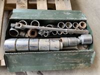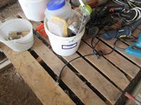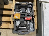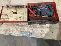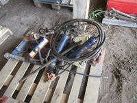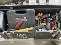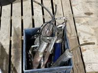Grease guns, tiger torch, sledge hammer, tool box with tools, caulking guns