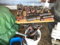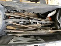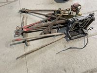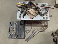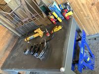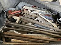Screwdrivers, levels, pliers, adjustable wrenches, 4 ton bottle jack, cattle prods, 200 ft tape, drill bit set, carpenter belts, miscellaneous