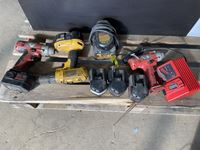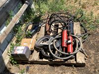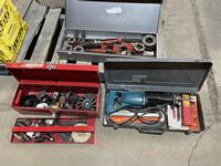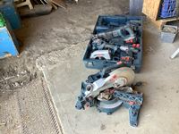 Makita Reciprocating saw, (2) angle grinders, (2) drills, electric chain saw, rope, 7 ft grinder discs, miscellaneous