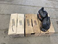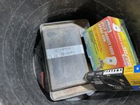 Trowels, box of binoculars, soaker pads, pry bar, small Makita drill