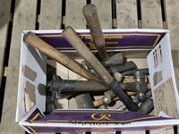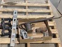 (2) pry bars, square, file set, hatchets, (2) grease guns