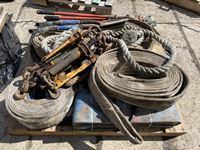 (6) slings, (3) truck chain pliers, (2) small shovels, bolt cutter, (4) load binders, tow rope