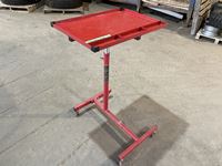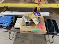 Tote of Straps, stings, wheels, hand tools, wooden shelf