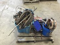 Tote of horse tack, pails of tools, bag of tools, lights, grease guns