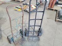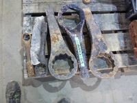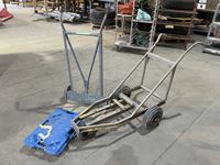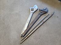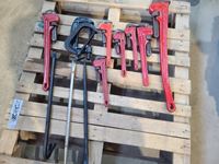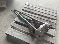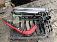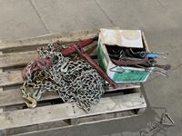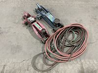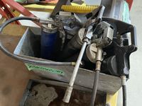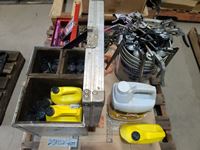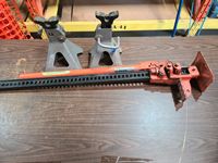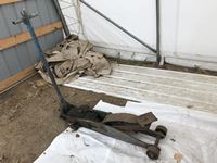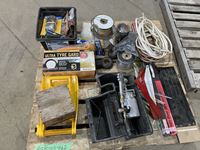 Bottle jacks, 13" tile cutter, pick axe heads, foot box of pins