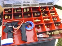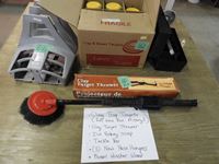 Clay trap targets (full box les 2), clay trap thrower, ice fishing scoop, tackle box, (3) hose hangers, power wash wand with brush