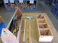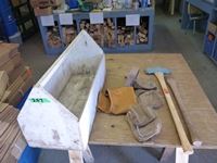 Double head axe, axe handle, wooden carpenters tool box, (2) carpenters belts