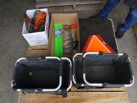 (2) soft tool caddies, trouble light, 8 ft booster cables, set of new truck mud flaps, slow moving sign, new tool organizers