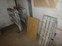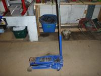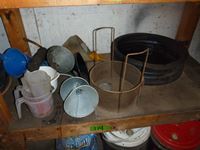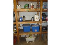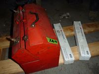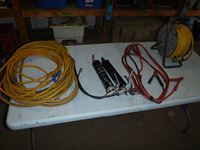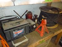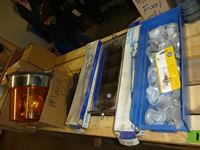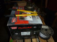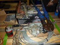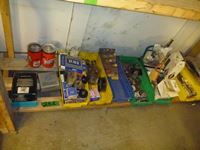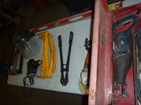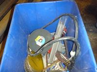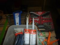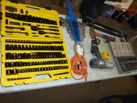 Socket set, wall mount can crusher, (3) cables ties, hose fittings, (2) trouble lights, large wood auger bits, metal tool box