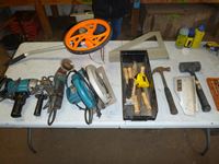 Staple gun, Maxim sanding kit, 1/4 ft socket set, pullers, hammer